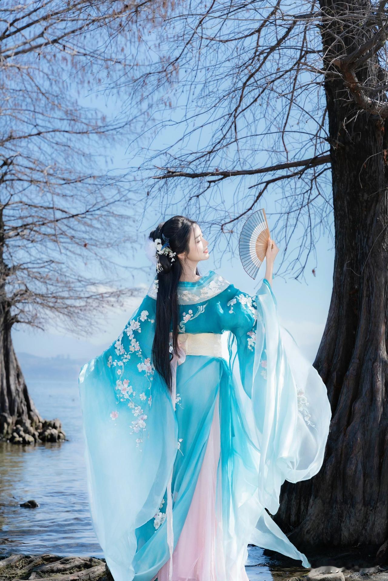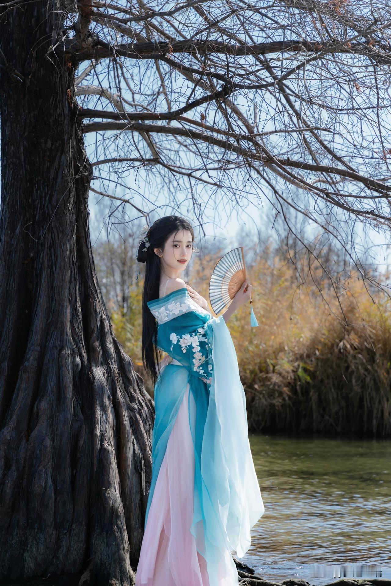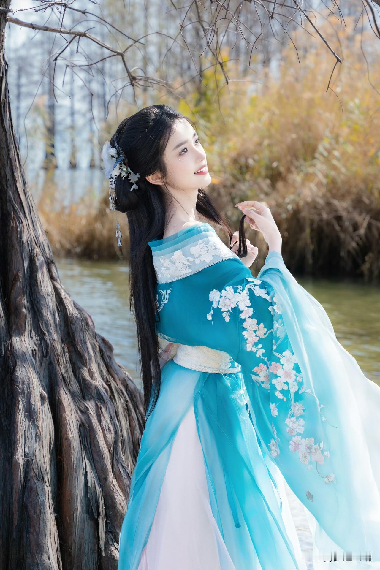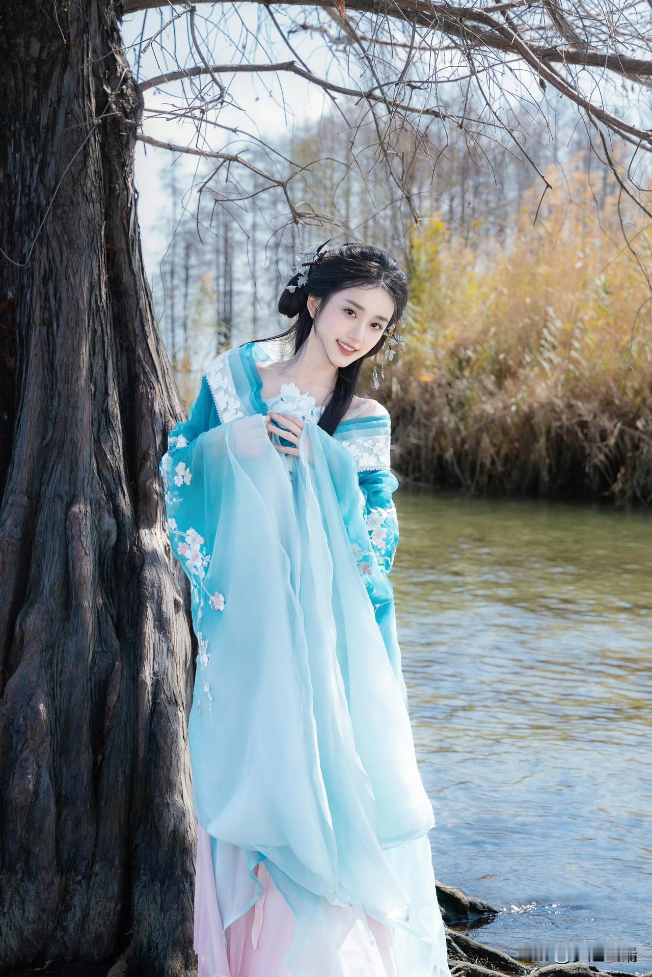秋日河畔,蓝衣美人倚树轻笑,如梦似幻。