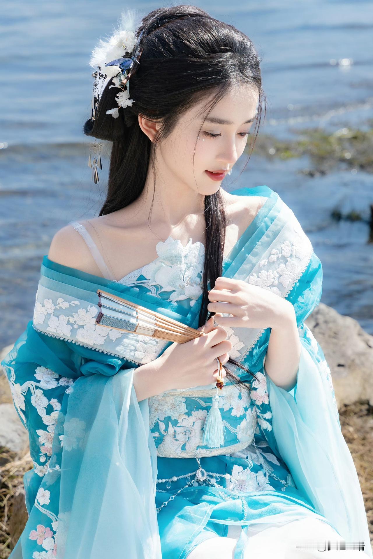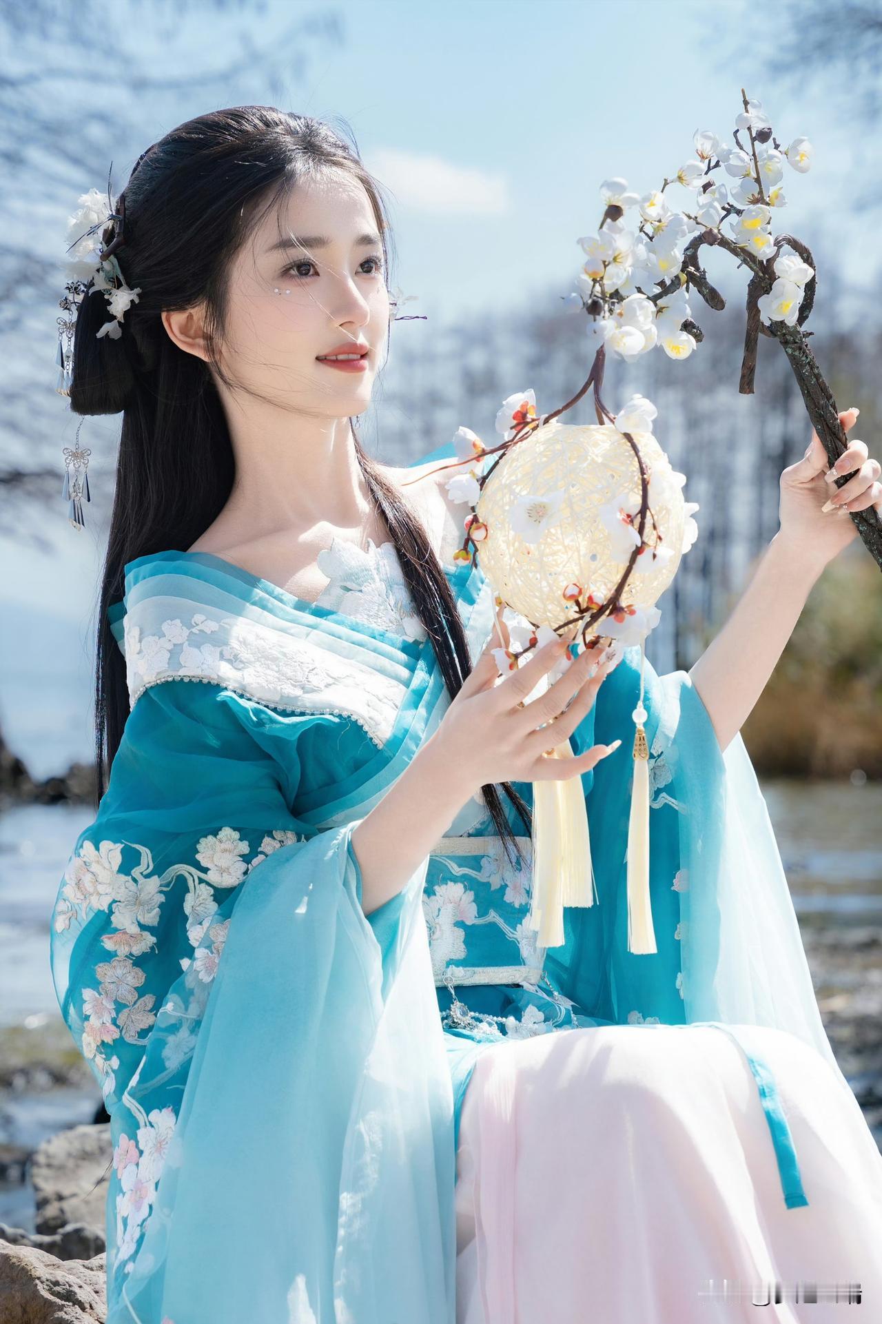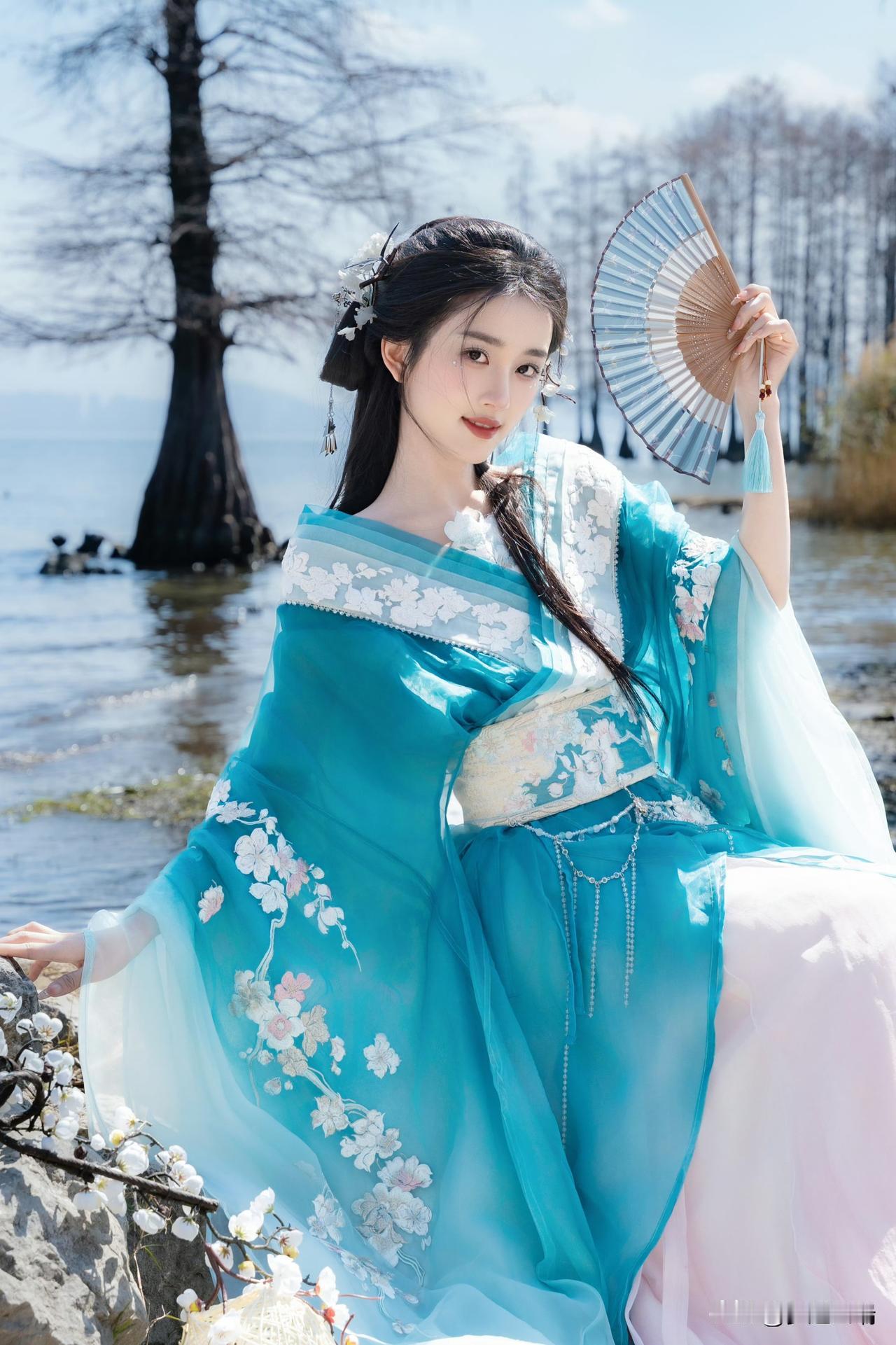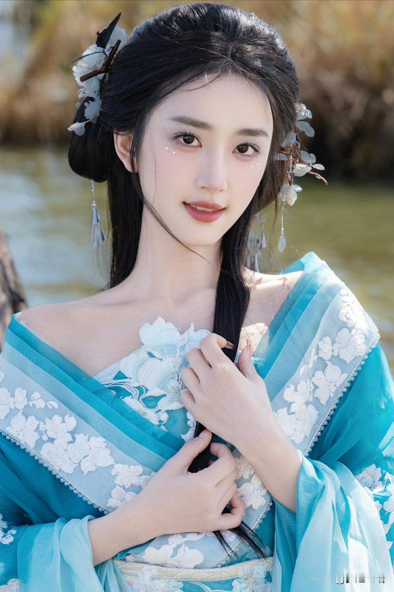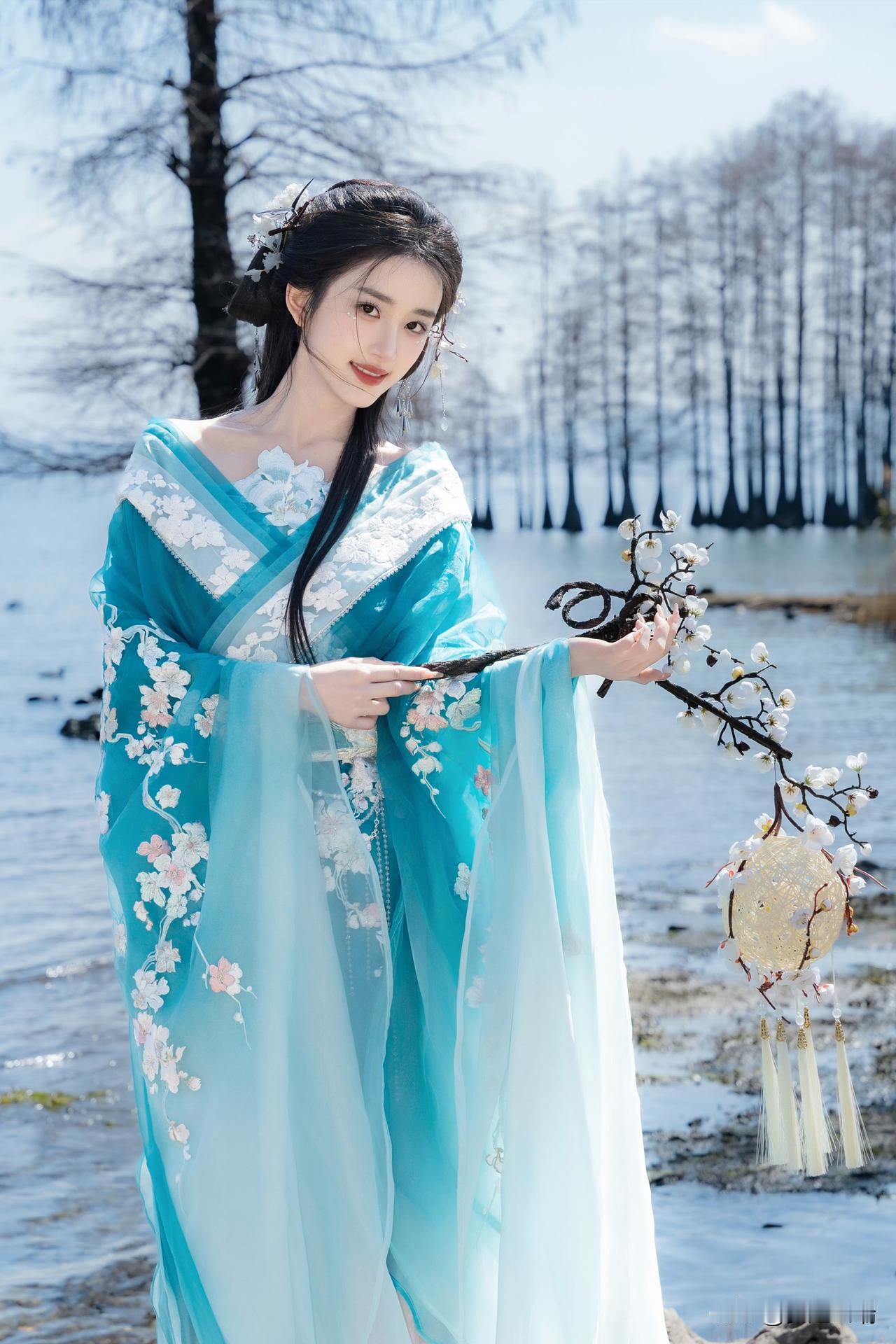 秋日河畔,蓝衣美人倚树轻笑,如梦似幻。