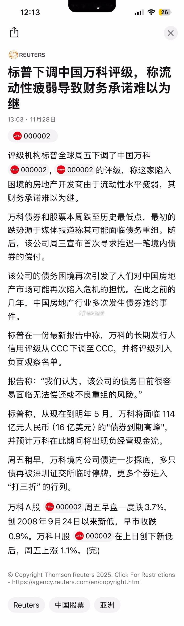 路透社:标普再度下调万科评级由CCC下调至CCC-