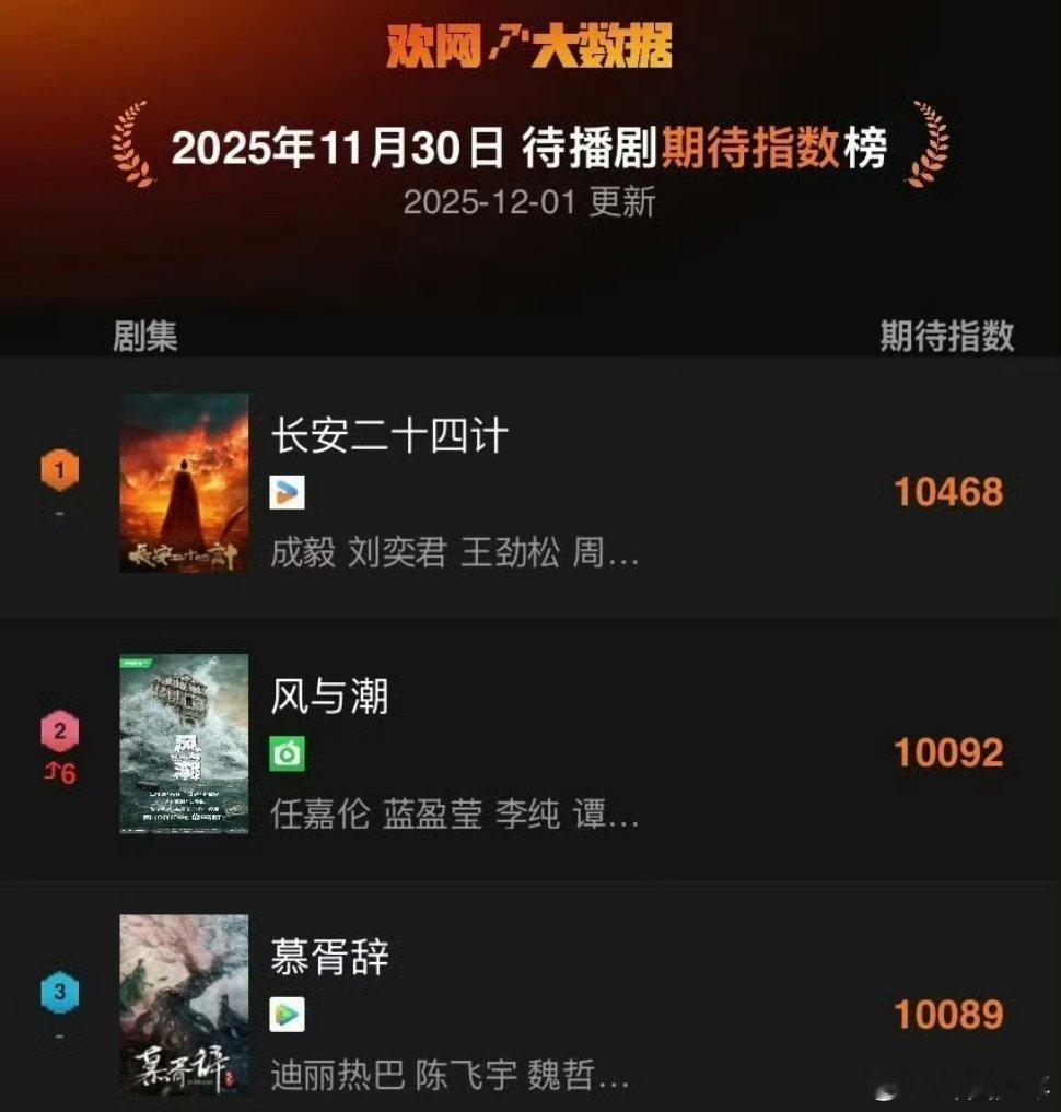 待播剧期待指榜数TOP3待播剧期待榜TOP3出炉!成毅✗《长安二十四计》 任嘉伦✗《风与潮》迪丽热巴✗《慕胥辞》全员高配置,期待指数均破万,你最期待哪部?