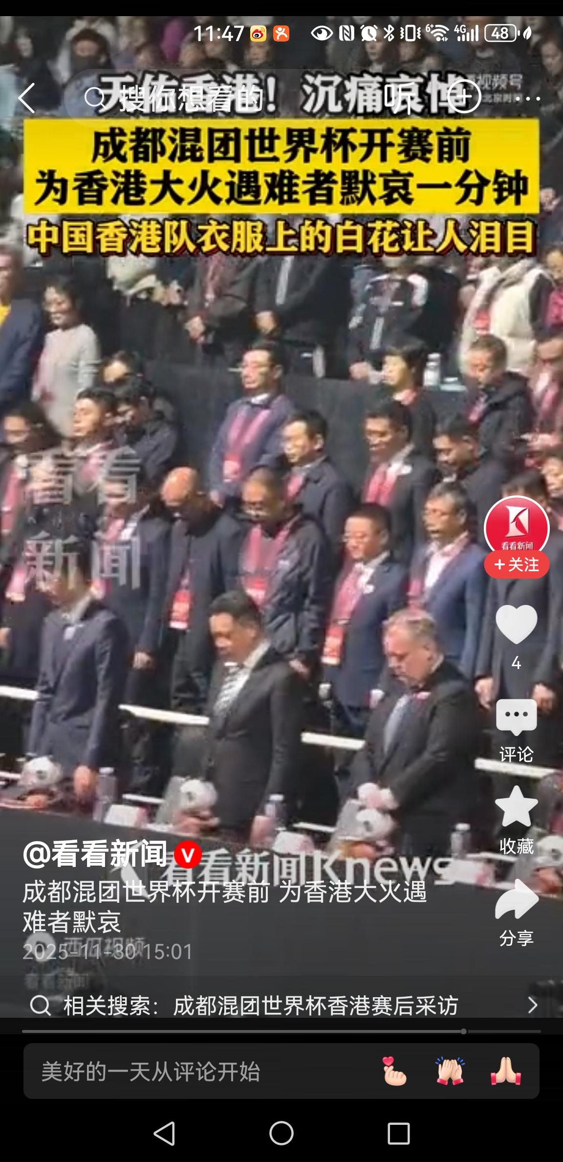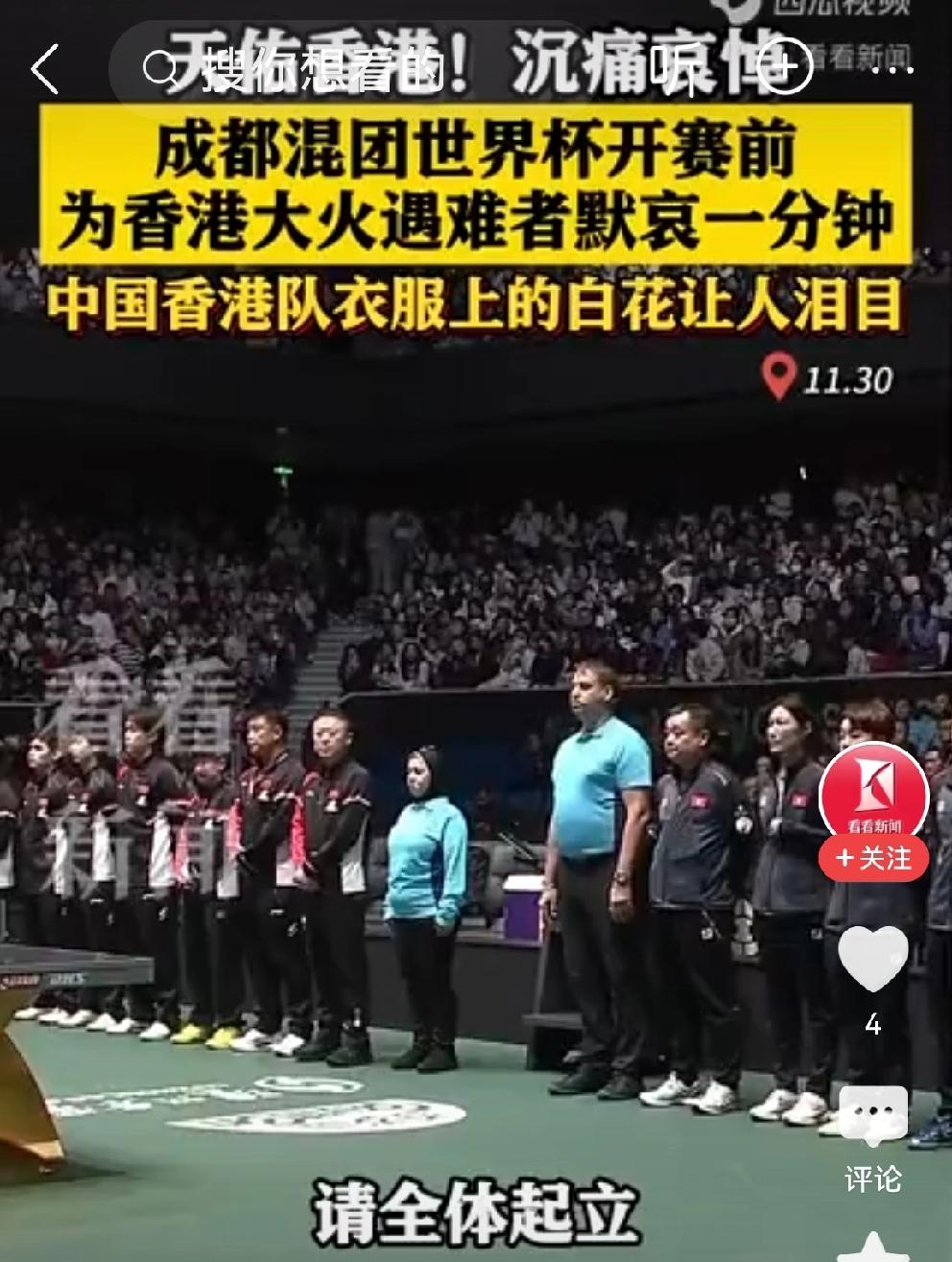 成都混团开幕式默哀环节,令人泪目[流泪] 昨天,成都混团世界杯开幕。首场比赛,中国队对阵中国香港队。 香港队员胸前佩戴白花上台,然后全场起立,为香港大埔火灾中罹难者默哀! 我们的国兵队员和香港队员,同时低头为香港罹难的同胞默哀。 观众席上,所有的观众也集体起立,低头默哀。 我们都是中国人,香港同胞有难,这就是所有中国人的痛! 为成都混团举办方点赞[赞][赞] 也为香港和国乒队员,为现场观众点赞👍