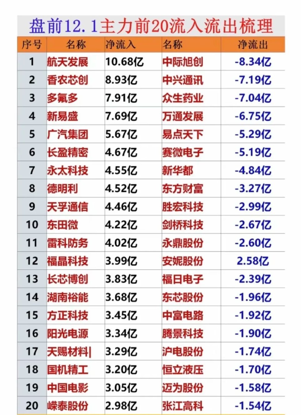 12月1日主力资金前20流入梳理分析今天资金净流入端集中在科技(航天、芯片、通信)、新能源、汽车等赛道,航天发展以10.68亿居流入榜首,契合早盘热点榜主线;净流出端多为前期热门的通信、医药、科技股。整体体现短期资金icon向当前热点赛道集中,同时对部分标的进行调仓。净流入TOP20个股分析1. 航天发展:净流入10.68亿居首,是早盘热点榜核心标的,依托商业航天+海峡两岸双概念,契合当前赛道热度,资金短期集中涌入。但概念炒作属性较强,后续需关注板块持续性。2. 香农芯创icon:净流入8.93亿,聚焦芯片产业链业务,当前科技赛道受资金关注,芯片是科技核心方向之一,资金借赛道热度布局,需跟踪其芯片业务的实际营收贡献。3. 多氟多icon:净流入7.91亿,主营氟化工、锂电池材料,新能源赛道近期情绪回暖,锂电池材料需求关联新能源车产业链,资金布局新能源细分领域,需关注行业价格波动。4. 新易盛icon:净流入7.69亿,涉及光通信器件,属通信、算力产业链环节,当前算力基建需求升温带动上游器件关注度,资金涌入布局,需跟踪行业订单与技术进展。5. 广汽集团icon:净流入5.67亿,作为车企龙头关联新能源车、智能驾驶赛道,汽车产业链有消费复苏预期,资金布局整车端标的,需关注新车型市场表现与销量。6. 长盈精密icon:净流入4.67亿,主营电子精密组件,适配消费电子、新能源汽车领域,下游需求回暖带动关注度,资金布局产业链组件环节,需跟踪订单情况。7. 永太科技icon:净流入4.55亿,涉及锂电池材料、氟化工,属新能源产业链细分标的,赛道热度外溢带动资金流入,需关注材料价格与产能释放进度。8. 德明利icon:净流入4.52亿,聚焦存储控制芯片,芯片是科技主线赛道,存储芯片icon关联算力、消费电子领域,资金借热度布局,需跟踪产品市场份额。9. 天孚通信icon:净流入4.46亿,主营光通信器件,属通信、算力产业链环节,算力基建需求升温带动上游器件,资金布局核心环节,需关注行业景气周期。10. 东田微:净流入4.22亿,涉及光学元件,适配消费电子、车载光学领域,下游需求复苏带动标的热度,资金布局光学细分环节,需跟踪应用拓展。11. 雷科防务:净流入4.02亿,是早盘热点榜标的,依托商业航天+毫米波雷达双概念,赛道协同性吸引资金,商业航天热度外溢下获布局,需区分业务与概念关联度。12. 福晶科技icon:净流入3.99亿,主营光学晶体icon,适配激光、半导体领域,上游材料需求随行业技术升级增长,资金布局上游环节,需关注技术迭代节奏。13. 长芯博创:净流入3.83亿,聚焦芯片业务,芯片是科技主线,资金向细分标的扩散带动其获布局,需跟踪产品商业化icon进展与客户拓展。14. 湖南裕能icon:净流入3.68亿,主营锂电池正极材料,是新能源电池核心环节,新能源车需求支撑材料需求,资金布局上游材料端,需关注价格与产能。15. 方正科技icon:净流入3.45亿,涉及PCB电子元器件,适配通信、消费电子领域,电子元器件是科技产业链基础环节,赛道热度带动资金布局,需关注需求变化。16. 阳光电源icon:净流入3.34亿,是光伏逆变器龙头,光伏赛道有政策与需求预期支撑,逆变器是核心环节,资金布局新能源龙头,需关注行业装机量。17. 天赐材料icon:净流入3.29亿,主营锂电池电解液icon,是新能源电池关键材料环节,新能源车需求带动电解液需求,资金布局材料端,需关注价格与竞争格局。18. 国机精工:净流入3.20亿,涉及轴承、超硬材料,适配高端制造、新能源领域,行业升级需求带动关注度,资金布局细分环节,需跟踪业务拓展。19. 中国电影icon:净流入3.05亿,是早盘热点榜标的,依托影视院线+《疯狂动物城2icon》IP热度,影视赛道随假期有复苏预期,资金布局影视消费端。20. 嵘泰股份:净流入2.98亿,主营汽车零部件,适配新能源汽车领域,新能源车需求增长带动零部件环节,资金布局汽车产业链细分标的,需关注车企订单。总结本次净流入标的集中在科技(航天、芯片、通信)、新能源、汽车、影视等赛道,与早盘热点榜主线高度呼应,资金偏向赛道核心标的与细分环节,同时净流出端体现部分前期热门股的短期调仓。后续需关注主线赛道的资金持续性,同时区分标的“赛道关联”与“业绩支撑”的匹配度,规避纯概念炒作风险。本文涉及资讯、数据等内容来自网络公共信息,仅供参考,不构成投资建议!股票a股