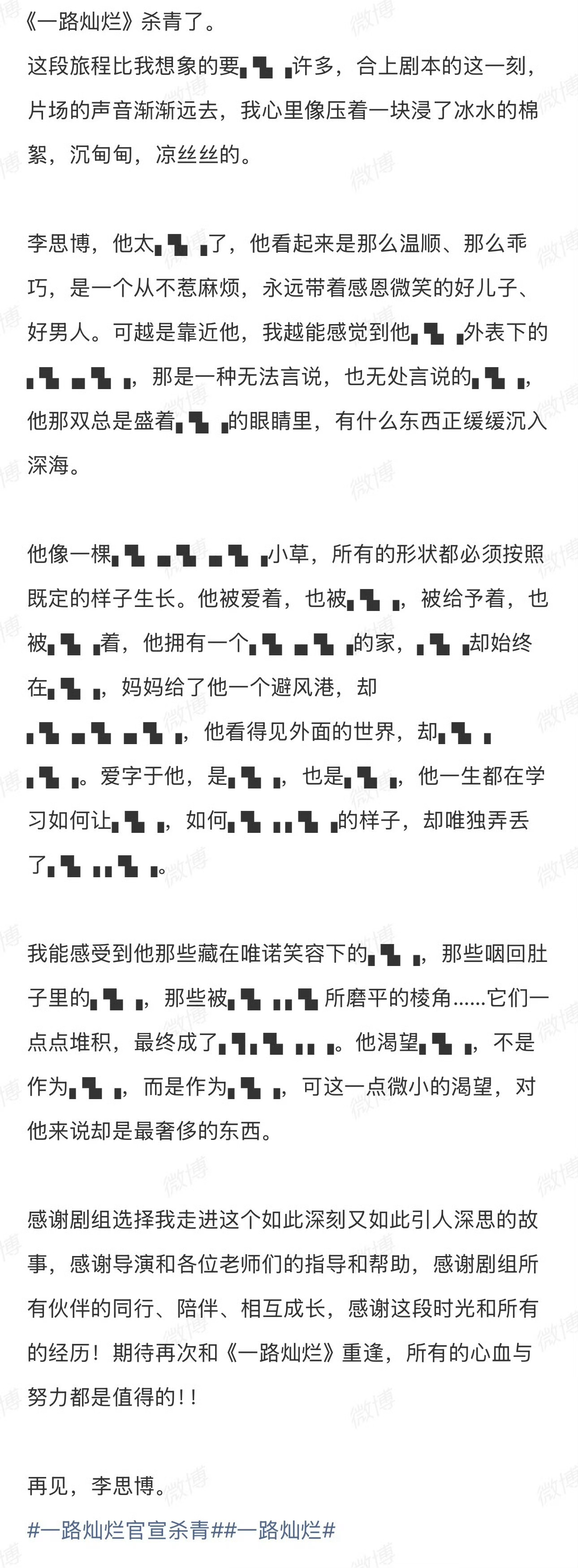 田嘉瑞给杀青作文打码了 悬疑剧主演的自我修养!田嘉瑞杀青作文打码防剧透,字里行间全是对角色的用心,这波“悬疑式”剧宣,谁能忍住不猜剧情?