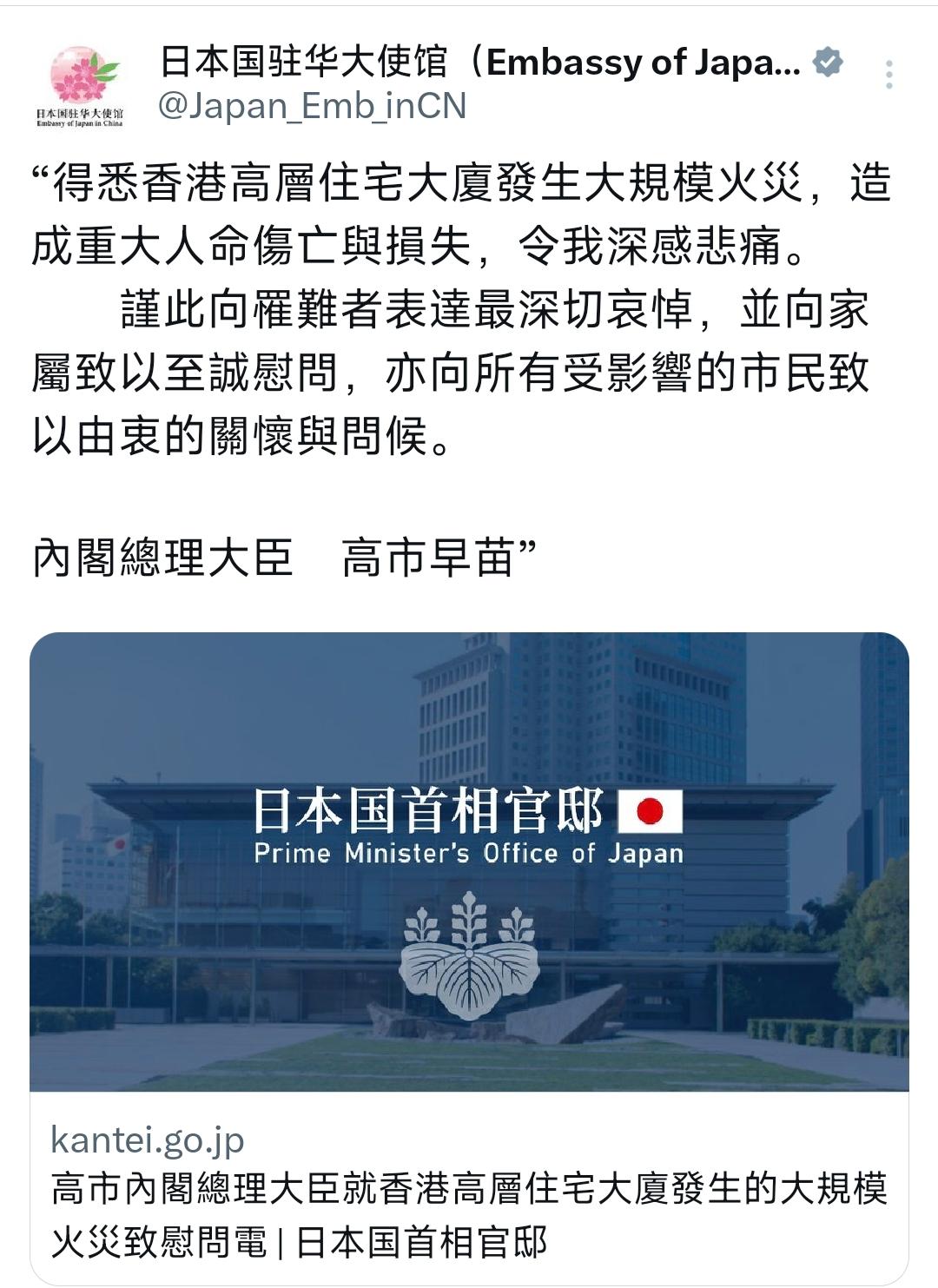 日本驻华大使馆发文写道:“得悉香港高层住宅大厦发生大规模火灾,造成重大人命伤亡与