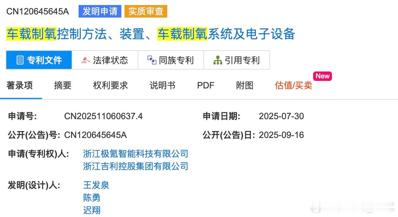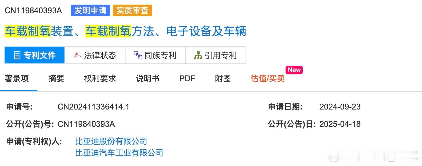 刚看了一下专利,比亚迪汽车,吉利汽车,奇瑞汽车,全部都在研究车载制氧设备。感觉后面出的新能源车,车载制氧会变成亮点,现在车企真的在想方设法研究各种用车场景。车辆制氧装置能够基于车辆当前状态信息控制进气以及制氧过程,提高在高海拔地区车辆制氧量的控制效果、使车辆座舱内氧气浓度维持在预设区间,并将制氧装置与车辆的供热空调系统进行整合。