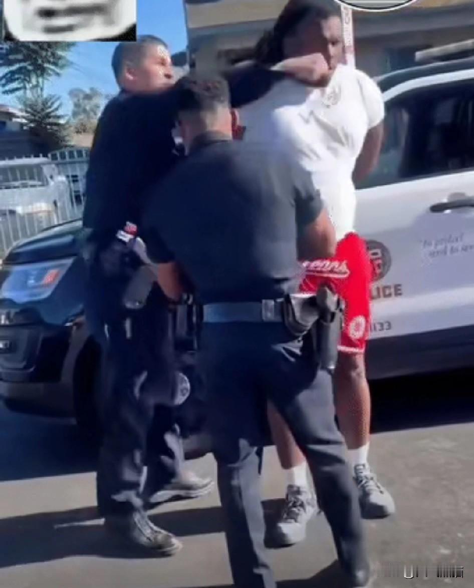 看看这美国警察逮捕黑人的场景,黑人稍微一反抗,警察就立即一拳砸在脸上,瞬间让黑人没了刚才的嚣张气息,不过这名黑人的块头确实是大,如果是一名警察的话估计很难对付的了,就是这两名警察一起,也并没有很顺利的把这名黑人制服,不过,这名黑人幸亏没有危险性的动作,否则,肯定自己有危险了。