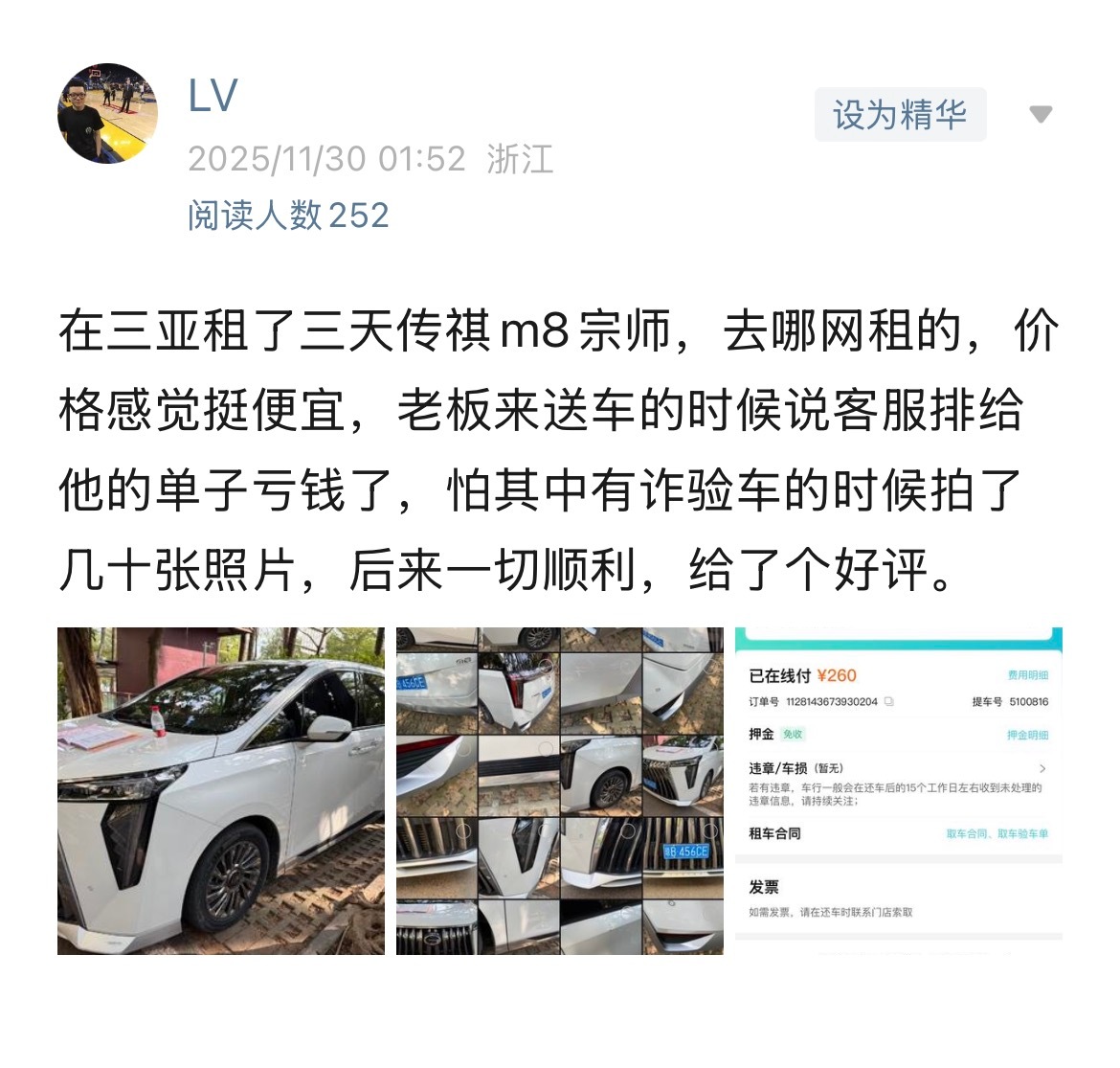 粉丝在三亚租了三天传祺M8,花费260元,现在三亚租车这么卷了吗?