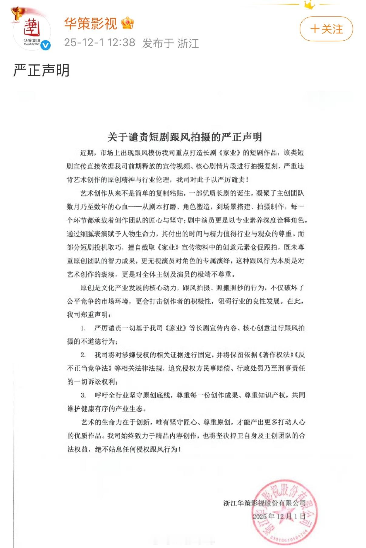 华策谴责短剧跟风拍摄杨紫家业的严正声明来了!