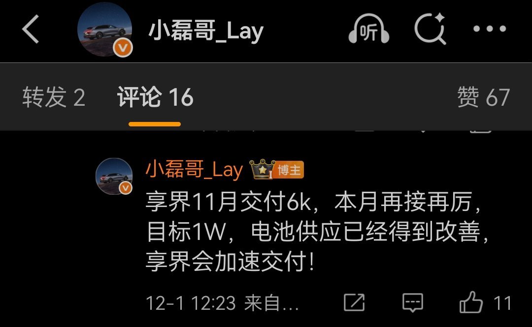 根据小磊哥回复,本月享界交付超6000,下个月的目标是一万,看来电池影响还是挺大的。那么这月的销量增长可能来自于尚界H5的可能性比较大鸿蒙智行