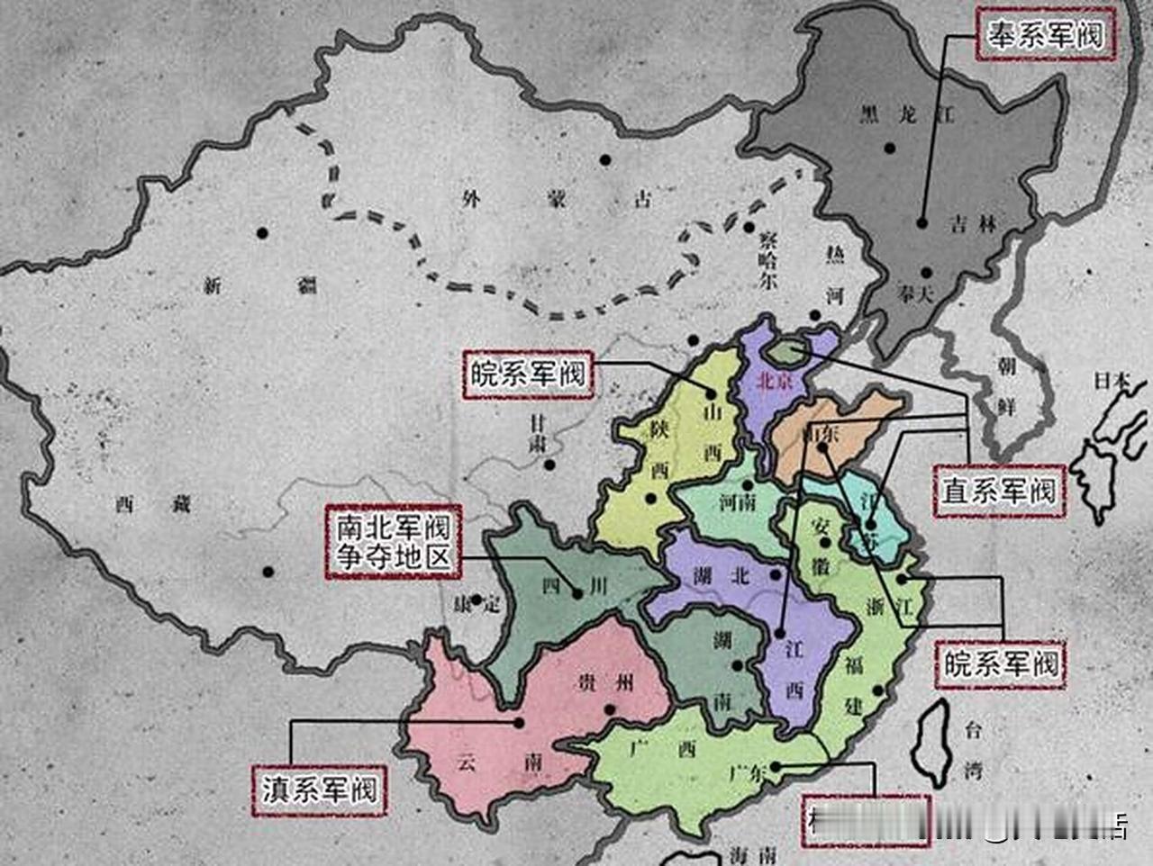 北洋军阀时期,全国各省最强军阀 黑龙江省 吴俊升,张作霖盟兄弟,奉系军阀后期二号人物。 统治时间:1921年3月 - 1928年6月。 吉林省 孙烈臣,张作霖盟兄弟,奉系军阀早期二号人物。 统治时间:1921年3月 - 1924年4月。 奉天省 张作霖,奉系军阀首领。 1927年,就任陆海军大元帅,成为北洋军政权最后一个统治者。 统治时间:1916年6月 - 1928年6月。 热河省 姜桂题,依附于皖系段祺瑞。 统治时间:1913年8月 - 1921年9月。 察哈尔省 张之江,冯玉祥麾下五虎将之一。 统治时间:1924年12月 - 1926年3月。 绥远省 李鸣钟,冯玉祥麾下五虎将之一。 统治时间:1925年1月 - 1926年1月。 陕西省 冯玉祥,新直系。1924年直奉大战时倒戈,导致吴佩孚兵败下台。北伐战争后,成为民国新四大军阀之一。 统治时间:1921年8月 - 1922年5月。 直隶省 曹锟,新直系领袖。1923年至1924年,担任民国总统。 统治时间:1916年9月 - 1923年10月。 河南省 吴佩孚,新直系二号人物,掌握军事实权,虎踞洛阳,试图武力统一全国,与张作霖展开大战。 统治时间:1920年9月 - 1924年10月。 山西省 阎锡山,晋军首领,主政山西长达38年。北伐战争后,民国四大新军阀之一。 统治时间:1911年10月 - 1949年4月。 山东省 张宗昌,奉系五虎将之一。 统治时间:1925年4月 - 1928年4月。 甘肃省 张广建,依附于皖系段祺瑞。 统治时间:1914年3月 - 1920年12月。 新疆省 杨增新,前清道台,民国后长期主政新疆。 统治时间:1912年5月-1928年6月。 宁夏省 马福祥,回族,原甘军将领。 统治时间:1912年8月 - 1920年7月。 青海省 马麒,回族,原甘军将领。 统治时间:1912年6月 - 1931年8月。 江苏省 孙传芳,直系后期领袖,与张作霖、吴佩孚并为北洋后期三大军阀。 统治时间:1925年11月 - 1927年3月。 安徽省 倪嗣冲,皖系,段祺瑞重要军事支柱。 统治时间:1913年7月 - 1920年6月。 江西省 李纯 ,直系冯国璋重要盟友。 统治时间:1913年9月 - 1917年8月。 浙江省 卢永祥,皖系,掌控浙江及上海地区。 统治时间:1919年8月 - 1924年10月。 湖北省 王占元,直系,直系冯国璋重要盟友。 统治时间:1915年12月 - 1921年8月。 湖南省 赵恒惕,谭延闿部下,1920年击败谭延闿,开始掌权。 统治时间:1920年11月-1926年3月。 福建省 李厚基,皖系军阀。 统治时间:1913年12月 - 1922年11月。 广东省 陈炯明,粤军首领,后来与孙中山兵戎相见,广州国民政府早期主要对手之一。 统治时间:1920年10月 - 1923年1月。 广西省 陆荣廷,旧桂系首领。 统治时间:1911年11月 - 1921年10月,1924年1月 - 1924年10月。 四川省 熊克武,四川军阀。 统治时间:1918年2月 - 1924年2月。 云南省 唐继尧,滇军创始人。 统治时间:1913年10月 - 1921年2月,1922年3月 - 1927年2月。 贵州省 刘显世,黔军首领,唐继尧重要军事盟友。 统治时间:1913年9月-1920年11月。