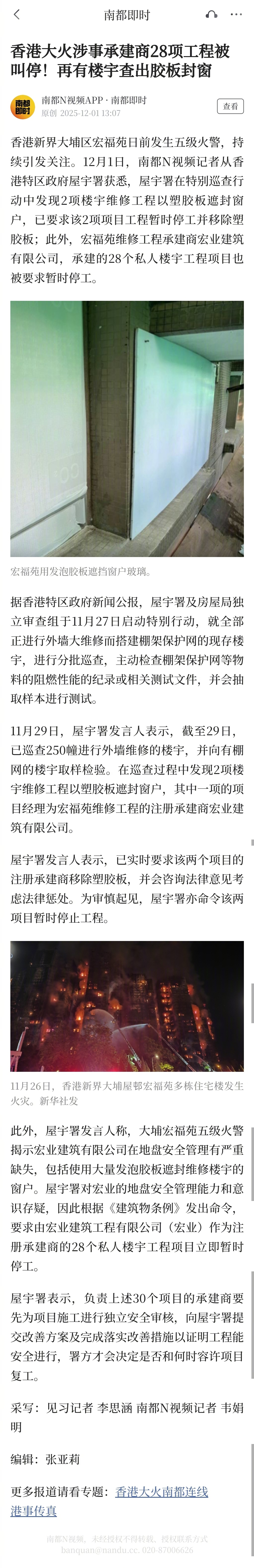 #香港大火涉事承建商28项工程被叫停#【香港大火涉事承建商28项工程被叫停!再有楼宇查出胶板封窗】#香港又有楼宇被查出用塑胶板封窗#香港新界大埔区宏福苑日前发生五级火警,持续引发关注。12月1日,南都N视频记者从香港特区政府屋宇署获悉,屋宇署在特别巡查行动中发现2项楼宇维修工程以塑胶板遮封窗户,已要求该2项项目工程暂时停工并移除塑胶板;此外,宏福苑维修工程承建商宏业建筑有限公司,承建的28个私人楼宇工程项目也被要求暂时停工。据香港特区政府新闻公报,屋宇署及房屋局独立审查组于11月27日启动特别行动,就全部正进行外墙大维修而搭建棚架保护网的现存楼宇,进行分批巡查,主动检查棚架保护网等物料的阻燃性能的纪录或相关测试文件,并会抽取样本进行测试。11月29日,屋宇署发言人表示,截至29日,已巡查250幢进行外墙维修的楼宇,并向有棚网的楼宇取样检验。在巡查过程中发现2项楼宇维修工程以塑胶板遮封窗户,其中一项的项目经理为宏福苑维修工程的注册承建商宏业建筑有限公司。屋宇署发言人表示,已实时要求该两个项目的注册承建商移除塑胶板,并会咨询法律意见考虑法律惩处。为审慎起见,屋宇署亦命令该两项目暂时停止工程。此外,屋宇署发言人称,大埔宏福苑五级火警揭示宏业建筑有限公司在地盘安全管理有严重缺失,包括使用大量发泡胶板遮封维修楼宇的窗户。屋宇署对宏业的地盘安全管理能力和意识存疑,因此根据《建筑物条例》发出命令,要求由宏业建筑工程有限公司(宏业)作为注册承建商的28个私人楼宇工程项目立即暂时停工。屋宇署表示,负责上述30个项目的承建商要先为项目施工进行独立安全审核,向屋宇署提交改善方案及完成落实改善措施以证明工程能安全进行,署方才会决定是否和何时容许项目复工。采写:见习记者 李思涵 南都N视频记者 韦娟明
