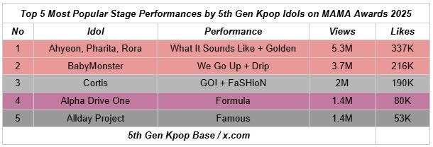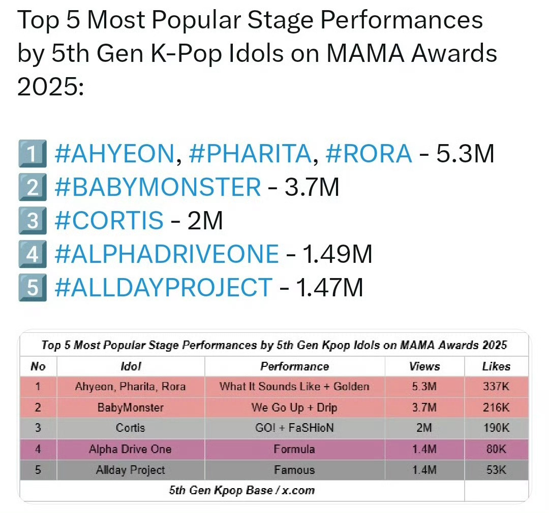 2025MAMA五代爱豆最受欢迎舞台top51.babymonster Pharita & 郑雅贤 & Rora 2.babymonster3.Cortis4.ALD15.Allday ProJect