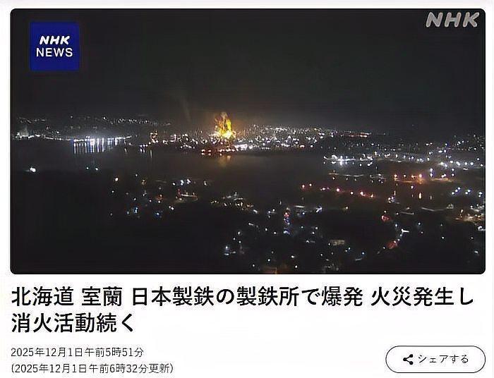 《火光冲天!日本制铁工厂凌晨突发爆炸,大火蔓延,救援持续》 当地时间十二月一日凌晨,日本北海道一处重要工业基地发生严重安全事故。据日本媒体报道,位于该地区的日本制铁公司旗下钢铁厂突发爆炸,厂区内一座热风炉在运行中发生异常,导致剧烈爆炸并引发大规模火灾。火势迅速蔓延,现场火光冲天,浓烟笼罩厂区上空。 日本制铁工厂 事故发生后,当地消防部门迅速启动应急响应。截至凌晨五时十分,已调派十四辆消防车及四十六名消防队员赶赴现场,全力展开灭火作业。由于火势猛烈且涉及厂内高温设施,扑救工作面临较大挑战。截至目前,大火仍未完全扑灭,消防人员仍在现场持续奋战,竭力控制火势扩散。 值得关注的是,此次发生事故的日本制铁公司是日本乃至全球重要的钢铁生产企业,其工厂安全运行对区域产业链具有重要影响。热风炉作为钢铁冶炼过程中的关键设备,通常在高温高压环境下运行,一旦发生事故,极易引发连锁反应。 所幸的是,根据初步报告,目前尚未发现人员在事故中受伤,周边居民也已得到安全提示。但事故造成的具体财产损失、生产中断情况以及对环境可能产生的影响,仍有待进一步评估。 近年来,日本制造业设施安全事故时有发生,此次爆炸再次敲响工业安全生产的警钟。目前,消防部门仍在现场处置,事故具体原因是否涉及设备老化、操作失误或管理漏洞,相关部门已着手展开调查。工厂后续复工时间及事故详细报告,仍有待官方进一步通报。