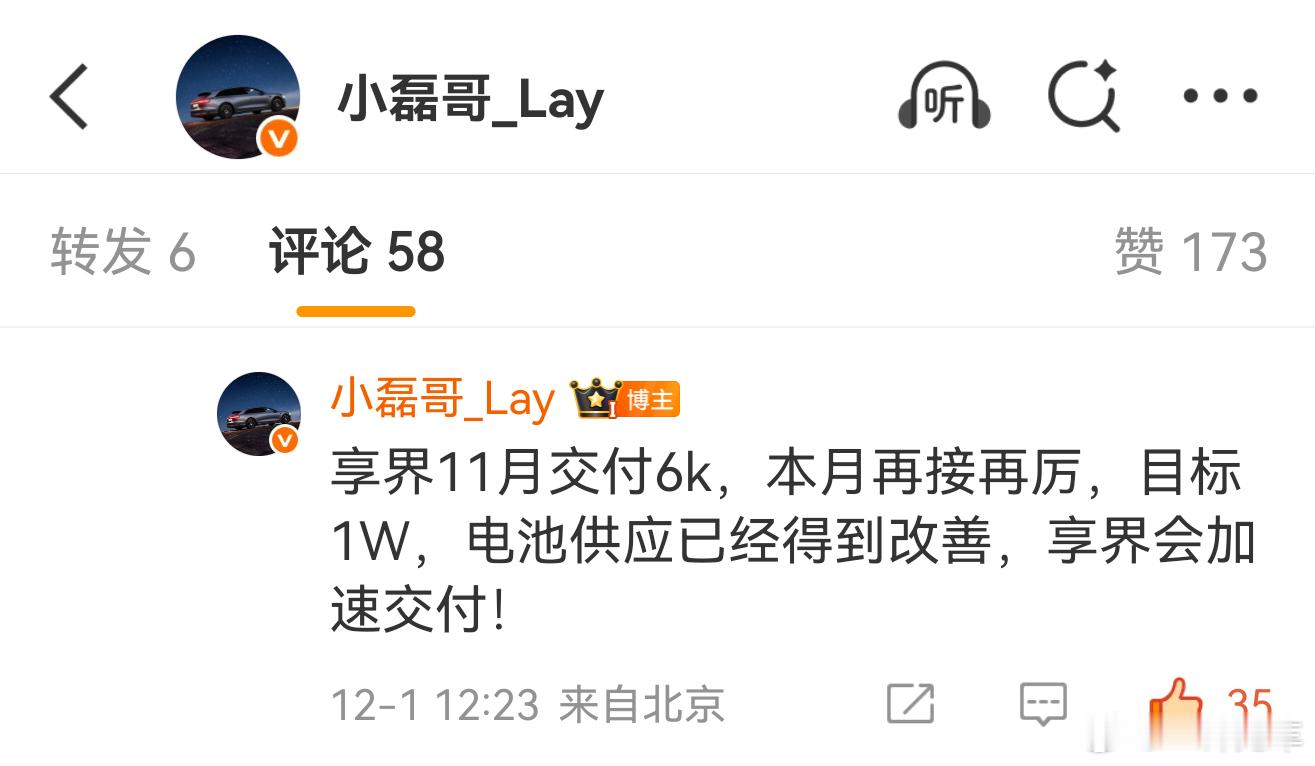 磊哥确认,享界11月交付6k,本月目标1W,电池供应已经得到改善,加速交付!