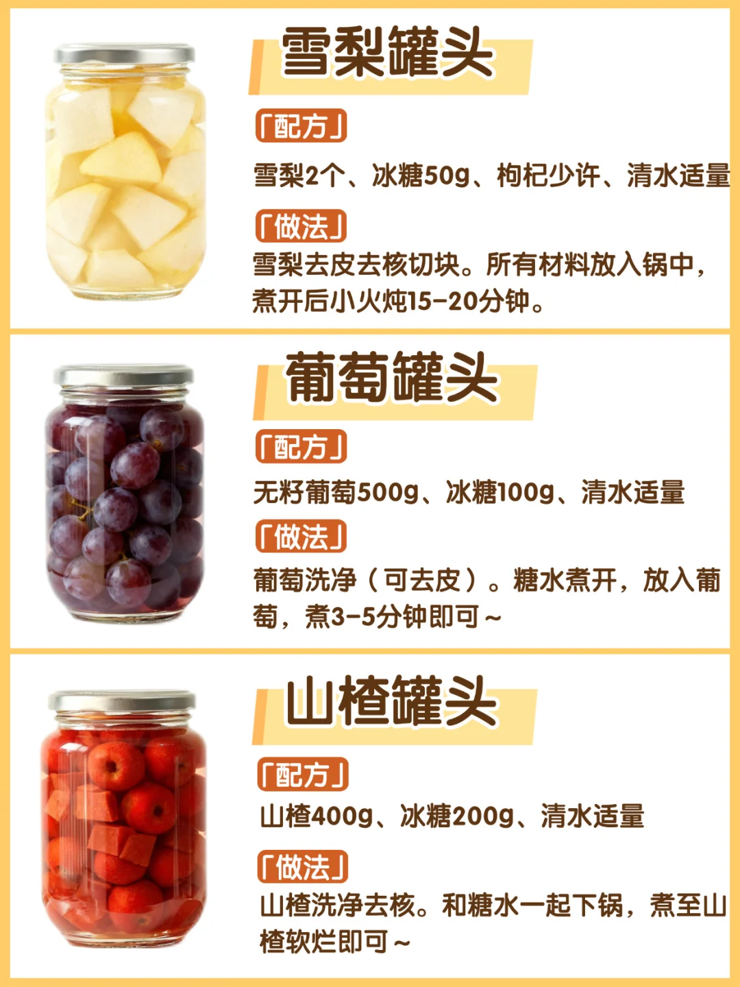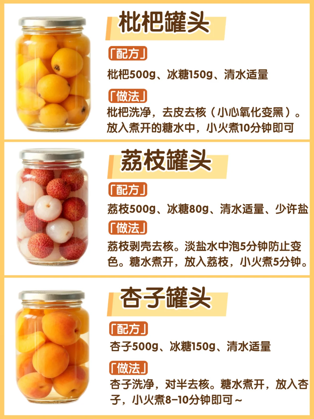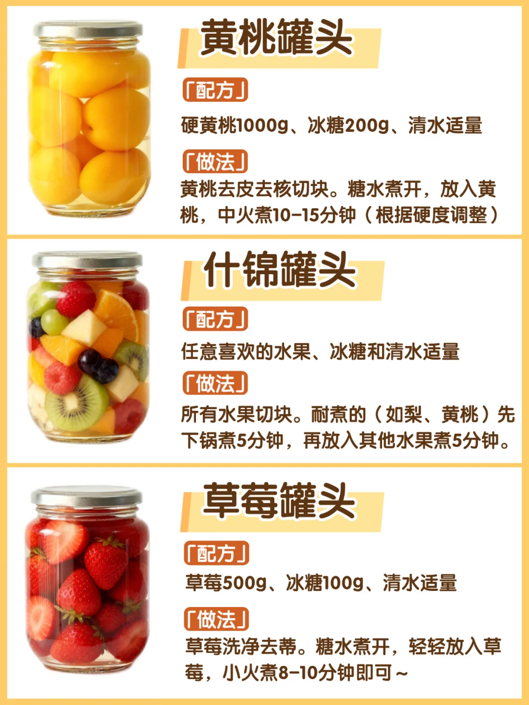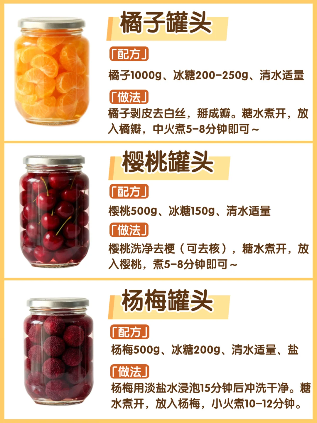 👋姐妹们!有没有和我一样,爱吃水果罐头的!今天教你们做12款水果罐头🔥自己做无添加更健康‼️冰冰凉凉甜甜的✅而且做法巨简单✅有手就会✅快学起来~ 草莓罐头 橘子罐头 荔枝罐头 枇杷罐头 葡萄罐头 山楂罐头 什锦罐头 杏子罐头 雪梨罐头 杨梅罐头 樱桃罐头 🔥万能基础糖水公式: 👉🏻清水+冰糖/白砂糖 比例是1:0.3到1:0.5,喜欢甜的多放点糖! 煮开后晾凉备用就是万能糖水啦! 💗快收藏学起来,感谢大家的点赞支持~