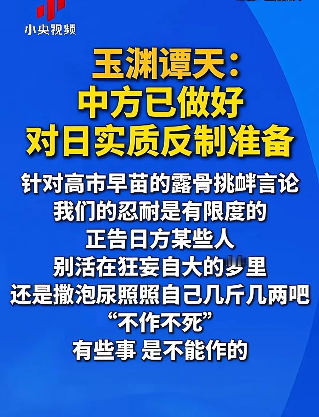 玉渊谭天这几句话,有几个重点。 第一,我们的忍耐是有限度的。自从高市早苗说了那些露骨挑衅的言论之后,我们采取了外交和经济等方面的施压,但我们这种相对温和的态度,日本人似乎看不懂。 第二,不作不死。关键字在一个死字。如果日本人还不能幡然醒悟的话,可能到时候,这几个字就会落在他们头上。