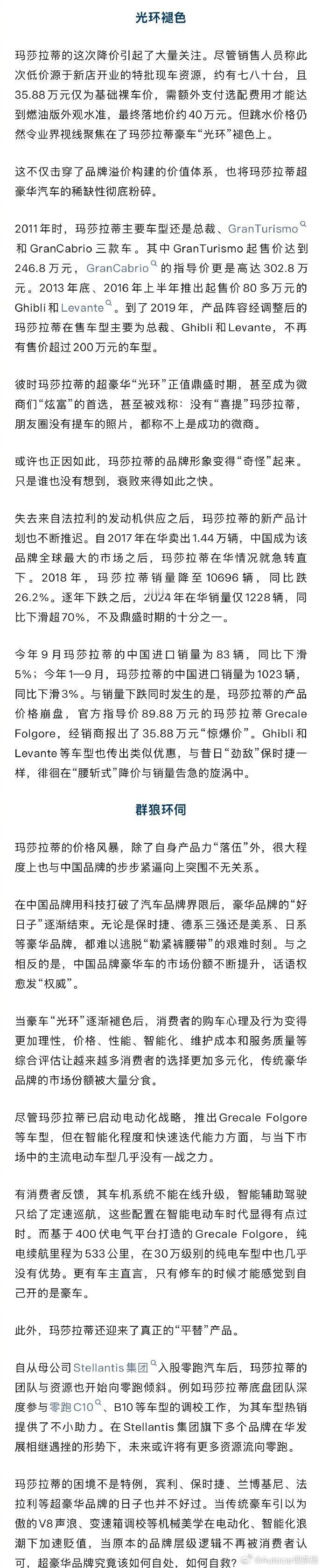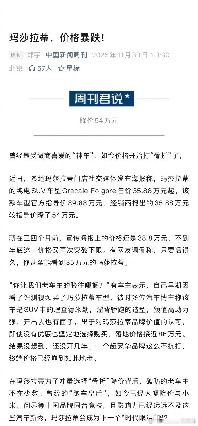 86万买的玛莎拉蒂没开几年骨折了玛莎拉蒂电车狂降老车主破防 曾经最受微商喜爱的“神车”,如今价格开始打“骨折”了。近日,多地玛莎拉蒂门店社交媒体发布海报称,玛莎拉蒂的纯电SUV车型Grecale Folgore售价35.88万元起。该款车型官方指导价89.88万元,经销商报出的35.88万元较指导价降了54万元。当年特斯拉的第一批买家也破过大防,但是35w的玛莎拉蒂对于我来说还是太香了