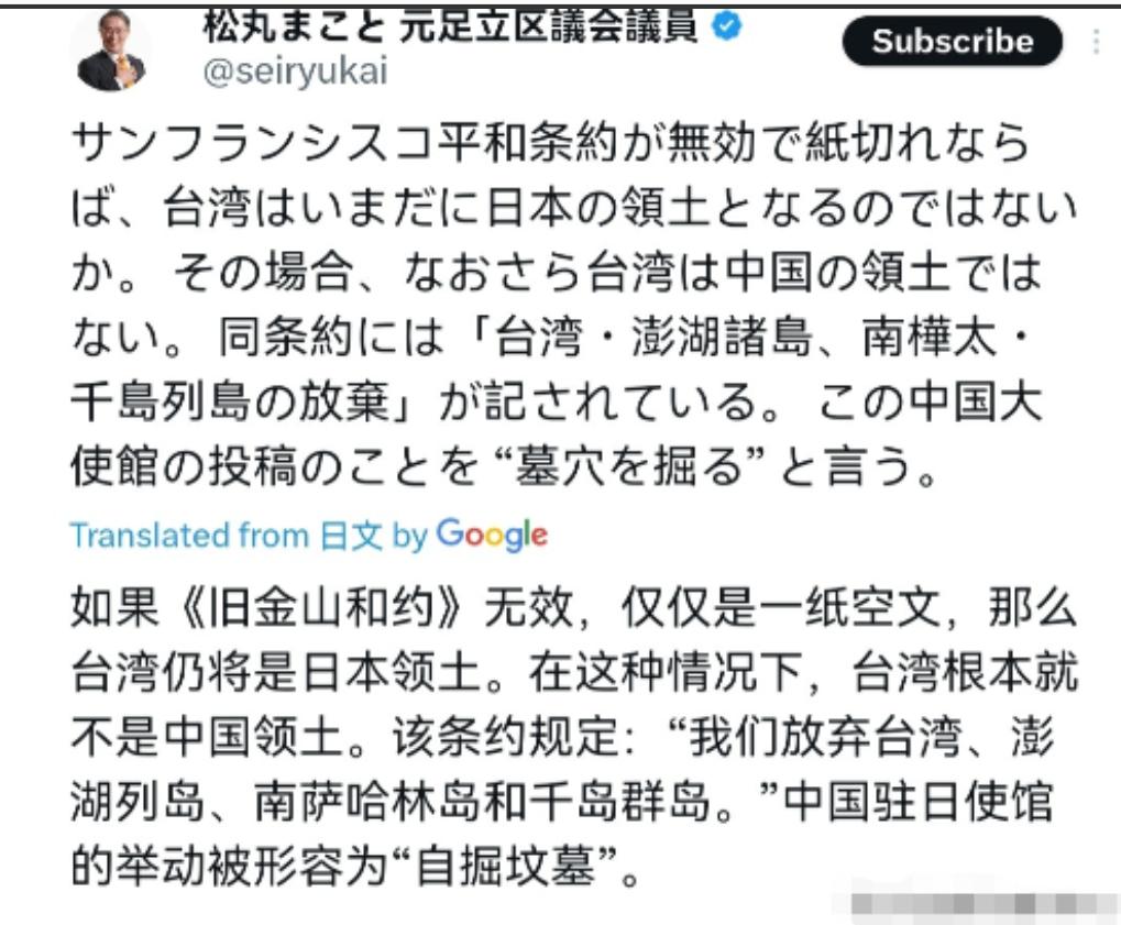 日本前议员松丸诚撂话,中国若不接受旧金山和约,那台湾就是日本“领土”!12月1日,松丸诚刊文声称,若《旧金山和约》无效、不过是一张废纸,那台湾不就依然是日本的“领土”了吗?倘若如此,台湾就“更不可能”是中国的领土了。该条约中明确记载着“放弃台湾、澎湖列岛、南库页岛及千岛群岛”。中国大使馆的相关发文,简直是“自掘坟墓”。 要戳穿这荒诞论调,先得扒光《旧金山和约》的底裤。1951 年那纸条约,是美国拉着一帮小弟和日本签的 “小圈子协议”。 从头到尾,作为二战主要战胜国的中国,连参会的请柬都没收到。一个连房子主人都没到场的 “分家会”,却要把主人家的卧室分给别人,这在法理上就是张废纸,在逻辑上纯属强盗逻辑。 松丸诚死死攥着 “日本放弃台湾” 这句话做文章,纯属玩文字游戏。这就像小偷被抓后,说自己 “放弃” 偷来的钱包,钱包就该归他一样可笑。 真正决定台湾归属的,是早于此的一系列铁证:1943 年《开罗宣言》白纸黑字写着 “台湾必须归还中国”;1945 年《波茨坦公告》再敲实锤; 同年日本投降书里,天皇亲口承诺遵守这些条款。这三道 “铁锁”,早把台湾和中国的关系焊得死死的,轮不到一张非法条约说三道四。 他的嚣张,藏着日本殖民台湾五十年的旧梦。1895 年《马关条约》后,日本在台湾搞 “皇民化运动”:烧中文书、逼说日语、给台湾人改日本名,甚至二战时抓了 20 万台湾青年当 “炮灰”。 1945 年 10 月 25 日台北受降仪式上,陈仪将军一句 “台湾重入中国版图”,台下老人哭着撕毁日本发的 “身份证”— 这份回归的重量,松丸诚之流故意看不见。 如今他们跳出来谈 “领土”,就是想给 “台独” 递刀子,去年台当局偷偷改教材淡化回归历史,和这论调简直是一唱一和。 而阴险的是,这狂言踩着美日同盟的鼓点。今年美日 “利剑” 军演,第一次把 “台湾有事” 写进剧本,日本自卫队还练起了 “保护在台日侨”。 这哪是保护侨民,分明是把台湾当 “自家地盘”。美国在背后推波助澜,一边卖武器给台湾,一边纵容日本右翼放话,就是想借 “台”“日” 两只手,捆住中国的发展。 松丸诚敢说 “中国大使馆自掘坟墓”,不过是仗着有美国撑腰的狐假虎威。 历史从来不会惯着谎言。远东国际军事法庭早就认定,台湾是日本 “非法窃取” 的中国领土;1972 年《中日联合声明》里,日本政府亲口承认台湾属中国,连日本外务省官网都存着这份文件。 松丸诚的言论,不光打了日本政府的脸,更暴露了右翼势力的野心:既要赚中国的钱,又要拆中国的台;既要享受和平红利,又要为侵略翻案。 现在的中国,早不是任人拿捏的年代。航母编队在西太平洋巡航,东部战区军演精准覆盖台海,183 个国家承认一个中国原则,联合国决议彻底堵死 “台独” 的路。这些硬实力和国际共识,就是守护领土完整的铜墙铁壁。 松丸诚的叫嚣,不过是历史长河里的一阵噪音。台湾是中国的一部分,这是刻在血脉里的事实,是用无数先辈鲜血换来的定论,更是中国军队绝不退让的底线。