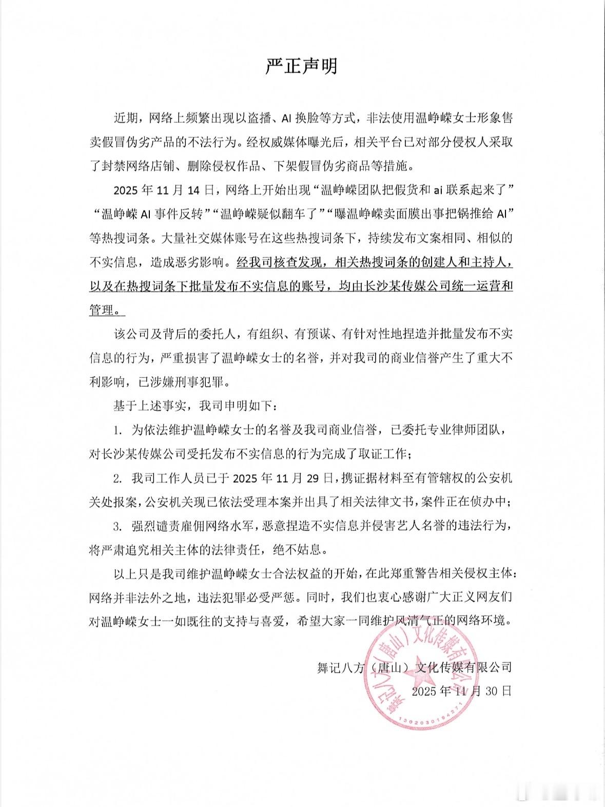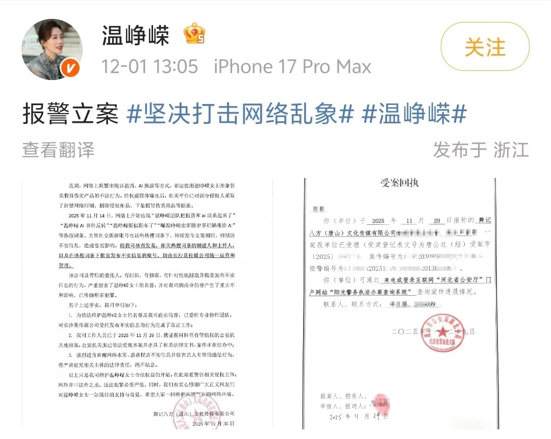 【温峥嵘方报案】温峥嵘发声 12月1日,演员发布严正声明,近日网络上出现“温峥嵘团队把假货和AI联系起来了”“温峥嵘AI事件反转”“温峥嵘卖面膜出事把锅推给AI”等词条,大量社交账号持续发布相同文案和不实信息,公司核查发现相关账号均由长沙某传媒公司统一运营和管理,现已报案,案件正在侦办中。