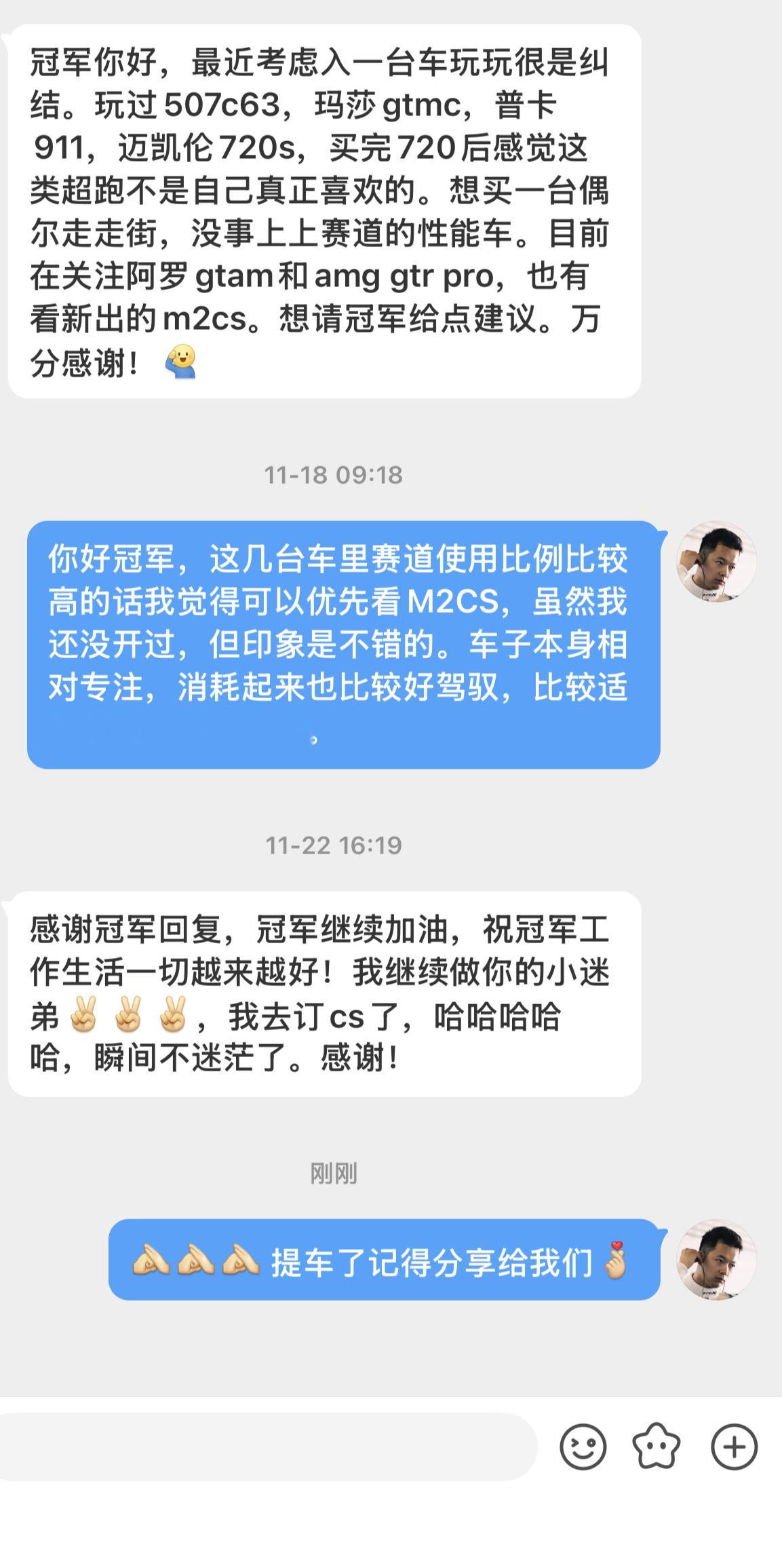 你们都订车了 我却还没开过M2CS 唉你好冠军,这几台车里赛道使用比例比较高的话我觉得可以优先看M2CS,虽然我还没开过,但印象是不错的。车子本身相对专注,消耗起来也比较好驾驭,比较适合赛道日尽情玩耍。欣哲频道冠军问答宝马m2cs