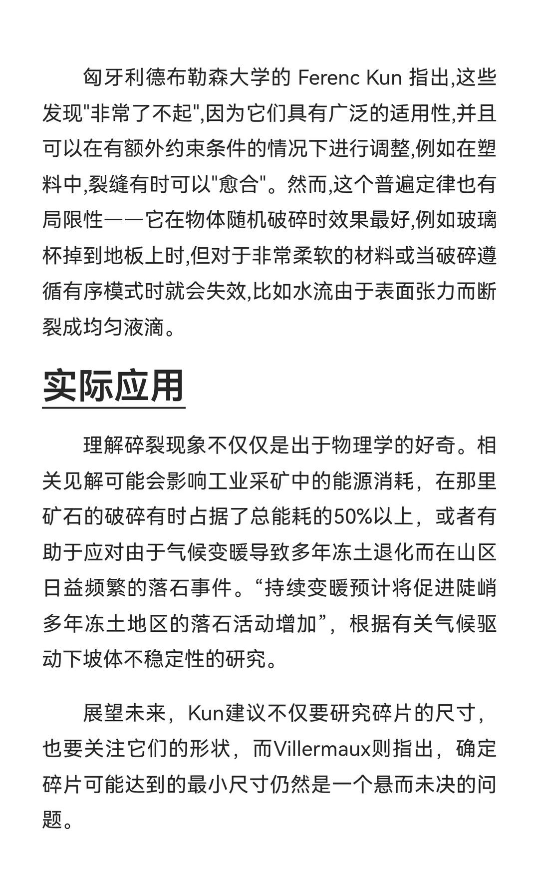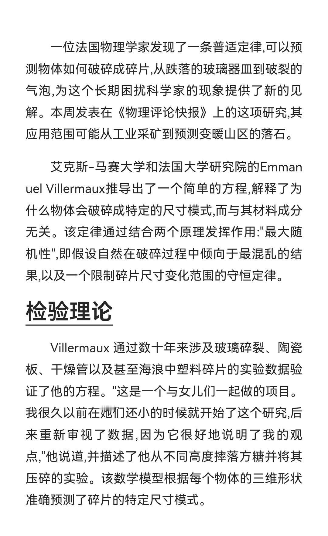 法国物理学家揭示物体破碎的普遍规律 一位法国物理学家发现了一条普适定律,可以预测物体如何破碎成碎片,从跌落的玻璃器皿到破裂的气泡,为这个长期困扰科学家的现象提供了新的见解。本周发表在《物理评论快报》上的这项研究,其应用范围可能从工业采矿到预测变暖山区的落石。​ 艾克斯-马赛大学和法国大学研究院的Emmanuel Villermaux推导出了一个简单的方程,解释了为什么物体会破碎成特定的尺寸模式,而与其材料成分无关。该定律通过结合两个原理发挥作用:"最大随机性",即假设自然在破碎过程中倾向于最混乱的结果,以及一个限制碎片尺寸变化范围的守恒定律。
