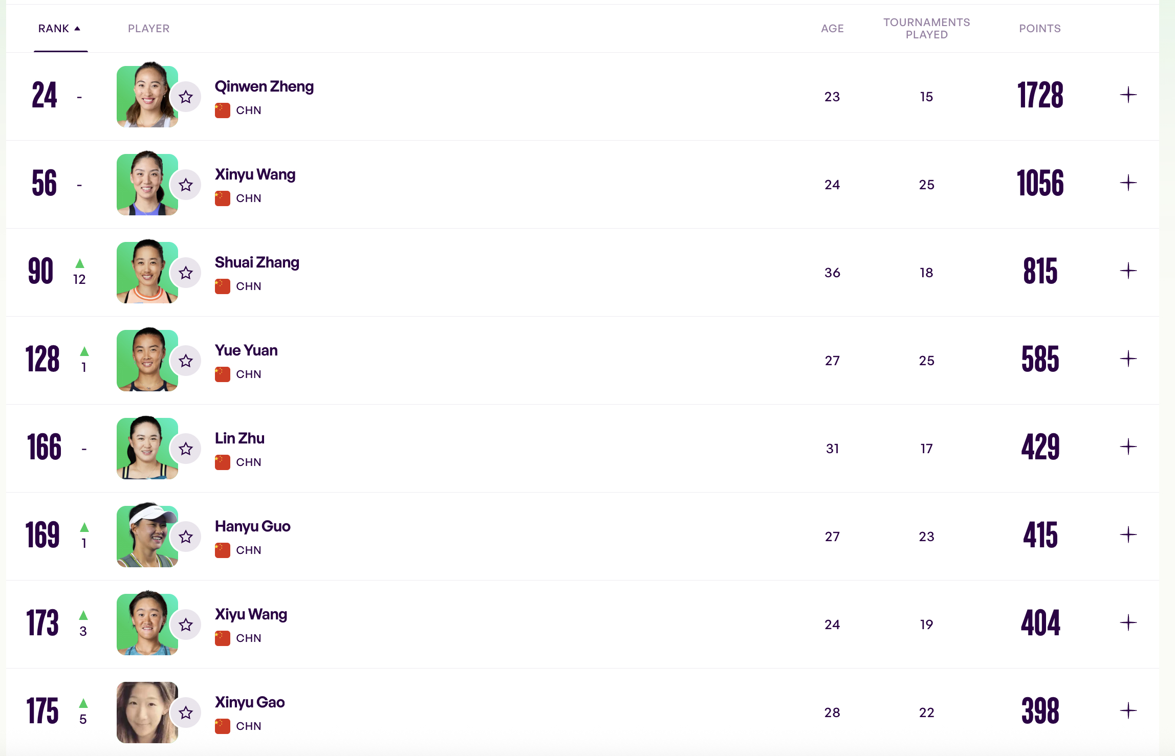 张帅单打世界排名重返前100 WTA更新最新一期世界排名,张帅时隔两年多重返前100,位列中国三姐,并成为top100中仅有的四位35岁以上的老将之一👏🏻No.43 科斯蒂亚 35.6岁 No.45 玛利亚 38.3岁No.46 西格蒙德 37.7岁No.90 张帅 36.8岁