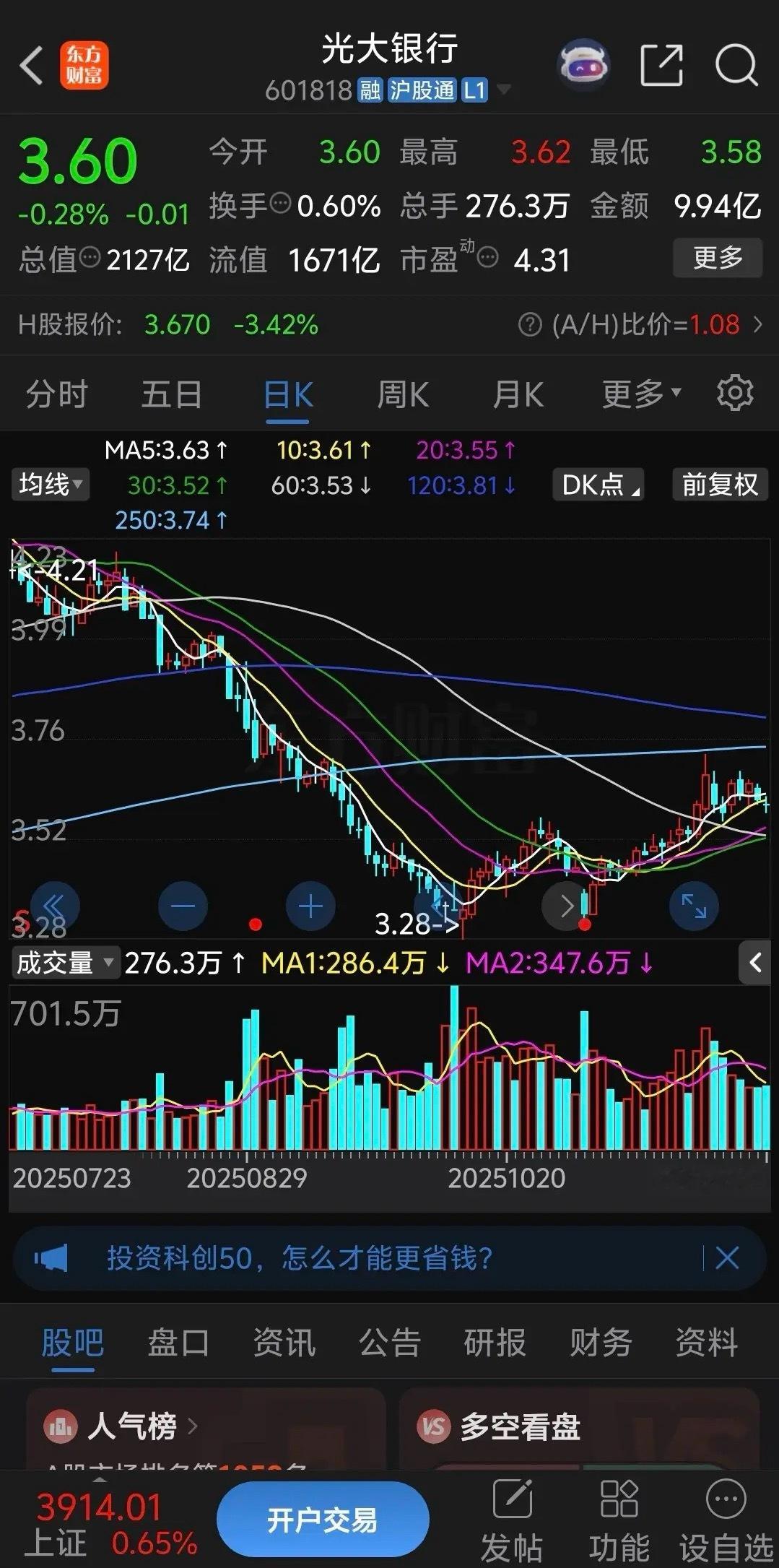四大最惨银行股仅光大银行下跌0.28%,民生银行经过前几天震荡后早盘拒绝下跌,早盘冲高震荡后持续拉升不断有万手大单抢筹,盘中大涨1.98%后出现回落,但是午后还是稳住了收盘上涨1.47%成交额高达20.76亿,同时港股民生银行再创反弹新高。北京银行上涨1.06%重新站上5.70关口,华夏银行上涨1.15%重新站上7元关口,银行板块仍然有很积极的看点,又有几个银行股马上就要突破本轮7月份高点,四大最惨银行股估值最低长线价值投资者千万不要割肉了。