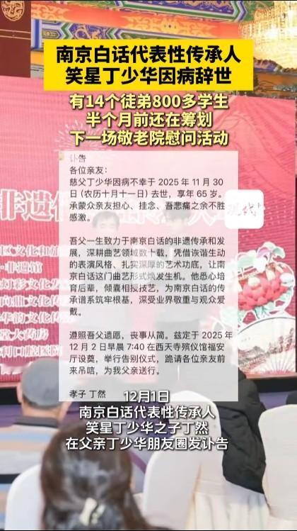 对现在的人来说,65岁实在太年轻了,真是天不假年,丁少华如此年龄就走了让人痛惜。他的师傅是梁尚义,师爷是张永熙。按照相声辈分来说,张永熙是宝字辈,梁尚义是文字辈,丁少华就是明字辈,与姜昆、郭德纲、于谦等都是同一辈。丁少华在南京拥有巨大的人气,很多人喜欢他说的相声,而且有14个徒弟和800多学生,也是为相声的繁荣发展作出了很大的贡献。