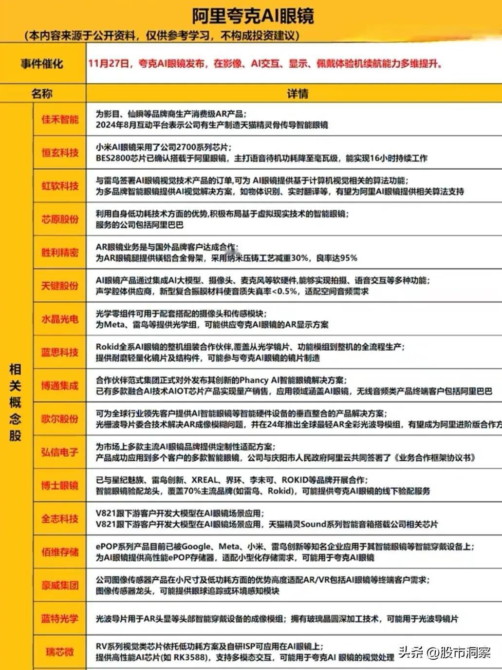 阿里夸克AI眼镜发布引领产业链多维升级,生态合作与技术革新成焦点 近日,阿里夸克AI眼镜的发布引发市场广泛关注。该产品在影像、AI交互、显示效果及续航等方面实现多维提升,显示出智能穿戴设备在技术创新与用户体验上的持续突破。从产业链来看,此次发布带动了上下游多个环节的积极参与,涵盖了光学元件、芯片设计、声学组件、结构材料以及整机制造等细分领域,展现出生态协作的广度与深度。 在技术层面,相关企业围绕低功耗芯片、AR显示方案、轻量化结构与AI视觉算法等方向展开布局,不断提升产品的集成度与性能表现。同时,AI大模型与硬件设备的融合也成为发展重点,推动智能眼镜向更自然的人机交互、更丰富的应用场景演进。从市场情绪来看,随着多家科技企业陆续入局,AI眼镜品类关注度逐步升温,产业链合作日趋紧密,反映出行业对智能穿戴未来发展的乐观预期。 展望未来,随着硬件迭代与生态内容不断丰富,AI眼镜有望在消费电子、行业应用等领域打开更大空间。然而,该领域仍面临技术成熟度、用户习惯培育等挑战,需要产业链持续投入与协同创新。整体来看,AI眼镜作为新兴智能终端,其发展路径仍处于探索阶段,但技术创新与跨界融合已为其注入长期成长潜力。 阿里AI产业链 智能眼镜AI ai眼镜 夸克AI工具 ai电子眼镜 ai眼镜排行榜 AI拍摄眼镜 ai芯片眼镜 股票知识 股市分析