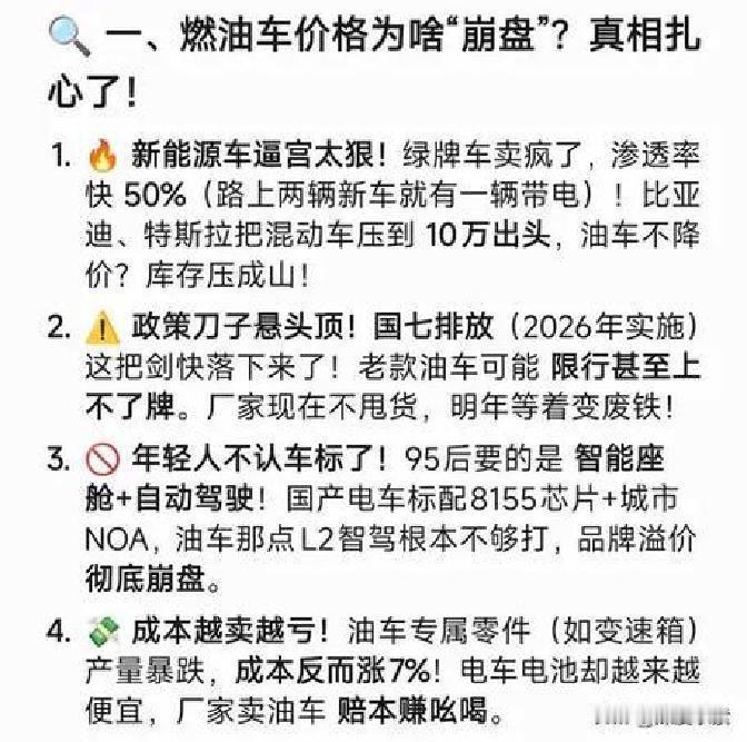 2026年燃油车圈子要翻天了!新油耗限值从元旦起就卡得死死的,比现在严了18%,比如一辆1.5吨重的自动挡轿车,百公里油耗得压到8升以内,大型SUV基本全线告急。纯油车想活命,得赶紧上混动这剂猛药,不然企业平均考核过不去,成本直线上升,买车价说不定就跟着水涨船高。 这时候,合资老将们没闲着,现代索纳塔N-Line直接甩出290匹马力,8速双离合变速箱配19寸大轮,加速那叫一个痛快,简直是老V6的接班人。福特蒙迪欧也升级了,2.0T爆261马力,还塞进大马力E混动系统,市区百公里才4.56升油,智能屏玩得飞起。高端局里,奥迪A6L稳坐销冠宝座,路虎揽胜极光L紧凑身材藏着强劲机械味,保时捷911更狠,6缸引擎一吼,纯燃油的灵魂就回来了,这些家伙用不可复制的驾驶快感死磕不退。 自主品牌呢?高端线杀气腾腾,2025上半年新能源都超51%了,他们混动技术直追合资,市场份额从合资手里抢了不少。合资的铁王座真晃悠了,得靠原创智能车翻盘才行。 我的看法?燃油车别急着唱凉凉,它那份油门反馈和长途稳健,还没人能全替。眼下清库存优惠多,补贴也管够,正是下手好时候。但长远混动是王道,选车得掂量自家油钱和路况,别被新规堵死后路。车市从单一霸王变群雄逐鹿,买车更得精打细算,玩出自己的味儿