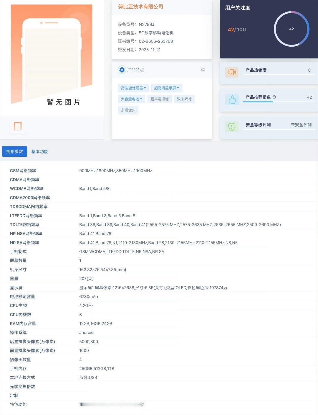 红魔 11 Air 工信部证件照出炉,型号 NX799J,依旧屏下摄像头,骁龙 8 至尊版处理器,厚 7.85mm,重 207g。- 芯片:骁龙 8 至尊版,入网了至高 24GB 内存;- 屏幕:6.85 英寸 2688×1216 OLED 真全面屏;- 相机:前置 16MP,后置 50MP 主摄 + 8MP 超广角;- 续航:额定 6780mAh;- 其他:厚 7.85mm,重 207g,机身侧面有进风口,疑似有主动散热风扇驭风 4.0。