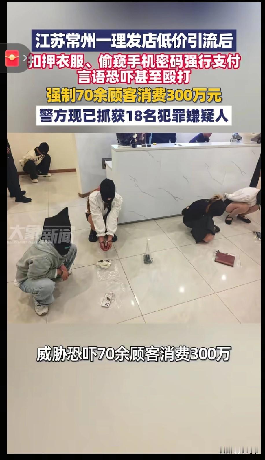常州一理发店以低价引流的幌子 先把顾客哄骗到店里 先给介绍说30元可以体验4次美容美发 再推荐拔罐说是50元到60元 但一次用上百个小罐子完事后 要价好几千,如果顾客不支付 就威胁恐吓扣押衣服甚至殴打顾客 强行支付,70多名受害顾客支付300万 目前已经抓获犯罪嫌疑人18名 按70人算的话,理发一次再加上他强制推销的项目,一次就消费4万多 马上就2026年了,还搞这一套,真是目无法纪,必须得对种人严惩不贷 让他们彻底遵纪守法