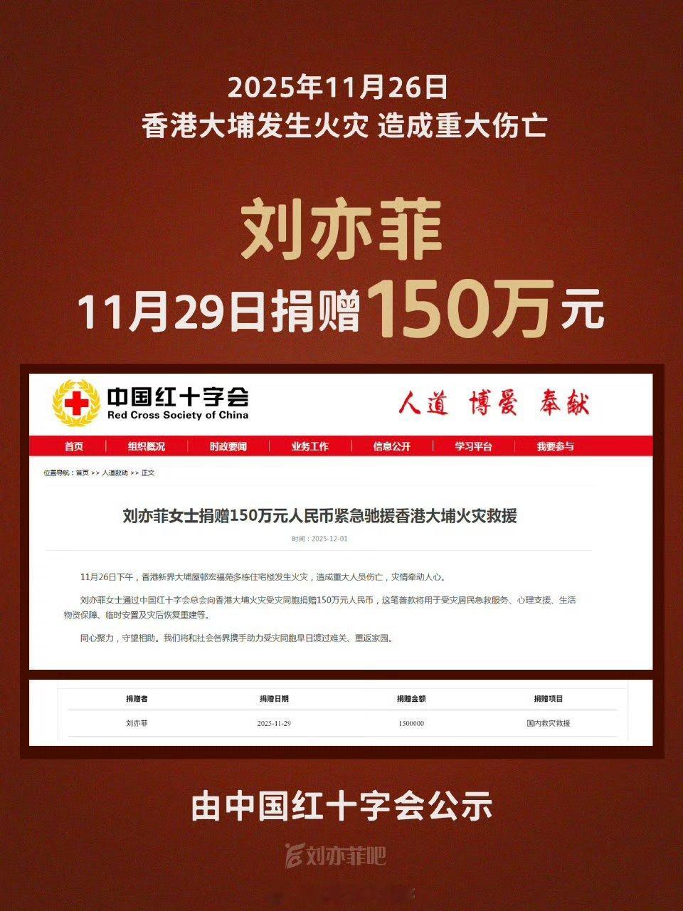 刘亦菲给香港捐了150万,红十字会公示了