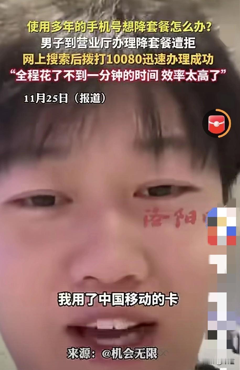 学到了,男子的移动卡用了许多年,是每月69的套餐。 最近他想降套餐,于是去营业厅。 营业厅说没有这个权限,办升套餐可以。 男子说我打10086说可以办理啊。营业厅说那你去10086办吧。 谁能想到,自从男子去营业厅说办理降套餐后,10086就一直打不通了。 于是男子就去网上各种查,最终查到打10080可以办理。 然后男子就拨打10080,没想到不到一分钟就办好了。 学到了吗?可惜我现在不用移动卡了。