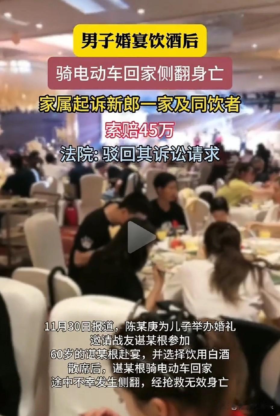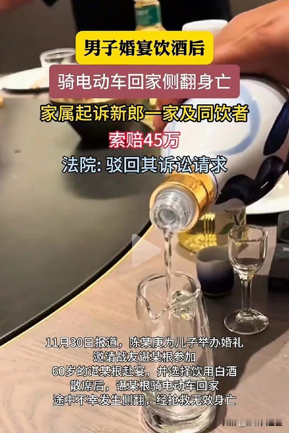 不是谁死谁就占理! 我们都清楚,朋友或同学聚会时,若同桌有人饮酒后意外离世,同桌的人往往都要担责。此前媒体对此类情况多有报道。 然而,近日媒体报道的一则案例却显示,并非所有同桌饮酒者都需承担责任。 近日,江西省宜春市中级人民法院公布了这样一起案例: 60岁的谌某根受朋友邀请参加婚宴,席间饮用了白酒,散席后他骑电动车回家,途中车辆不幸侧翻,经抢救无效死亡。 事后,谌某根的妻儿将宴请方陈某庚及其儿子儿媳、两名共同饮酒者共5人起诉至法院,要求这5人共同担责,索赔45万余元。 但一审法院认为,谌某根的死亡虽与喝酒有关,可家属要求5人承担注意照顾义务缺乏事实与法律依据,遂判决驳回其诉讼请求。谌某根妻儿不服一审判决提起上诉,二审法院同样驳回了他们的上诉。 据悉,谌某根参加朋友的结婚宴请时,席间无人劝酒,他是自斟自饮。同时,其死亡后,交警部门经酒精检测,发现他不属于醉酒状态,因为他没喝多少酒。 所以,他骑电动车回家途中摔倒死亡可能另有原因。 但其家人却无理赖三分,将他的意外死亡归咎于他人,或许是看多了“喝酒死亡,同桌担责”的报道吧? 法律注重证据,法官也是经调查后依据法律规定作出判决。因此,网友们对法官的判决颇为称赞。 不过,此事也再次提醒人们,同桌饮酒切勿劝酒,自己喝酒也要量力而行。 对此,大家怎么看?喝酒死亡赔偿 酒后致死 聚餐猝死 拼酒致死赔偿 喝酒后的小常识