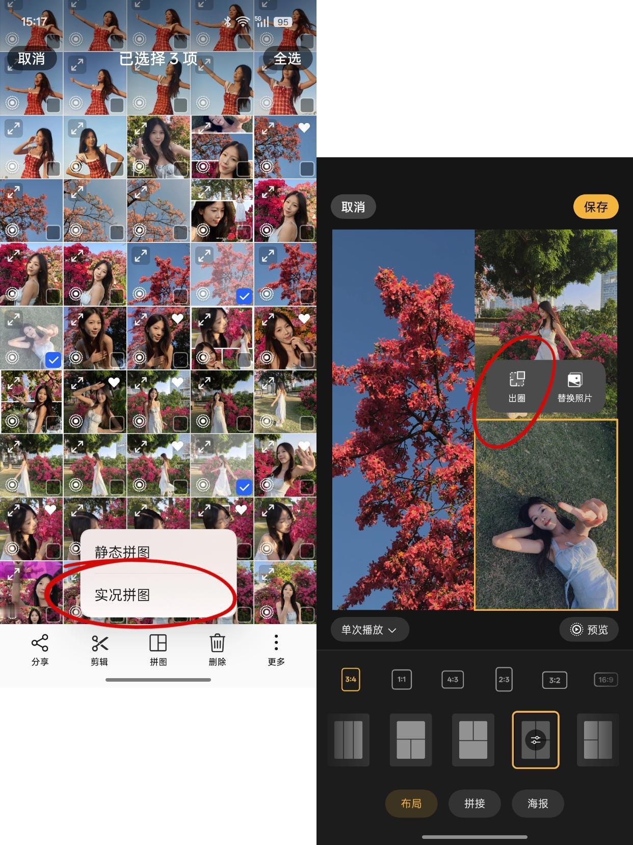 OPPO实况照片这块太权威了! 🙋♀️有多少人是被三拼出圈实况种草,才入OPPO Reno15的? 用过的都知道,这个功能玩法太多了!! 而且巨简单,不用复杂的操作,三步轻松搞定 一拍1️⃣先拍几张实况 二拼2️⃣在相册里多选要拼的图,勾选实况拼图 三出圈3️⃣点击想要出圈的实况照片,选择出圈即可 编辑的时候还能加上各种边框美化、随意调整排版 最后看看效果,大家觉得怎么样? OPPO现在在实况这块太权威了 拍照又强live玩法还很多 而且还有2亿像素、CCD闪光实况、4K实况一拍多出~ 感觉都比iPhone好太多啊,妥妥live神器~