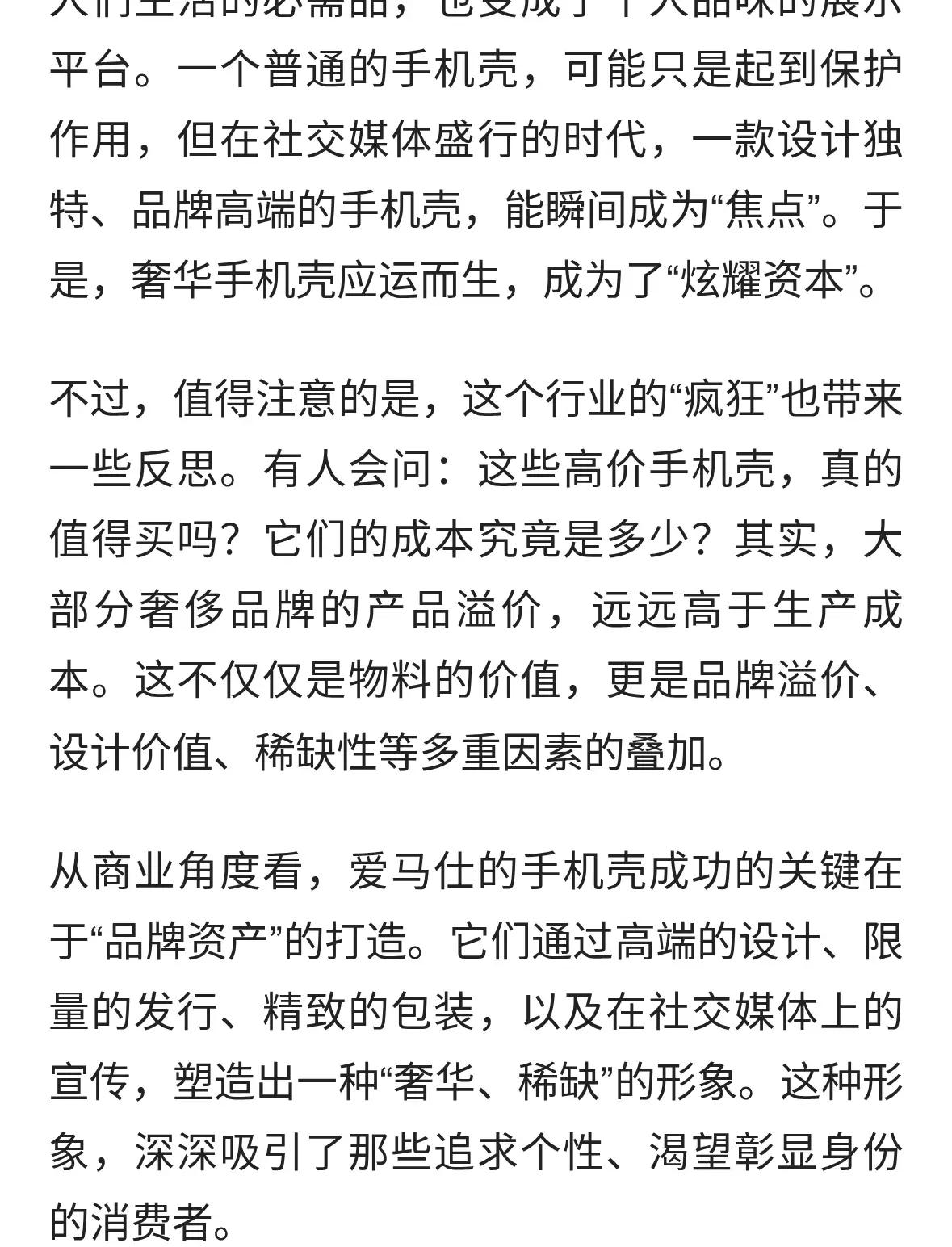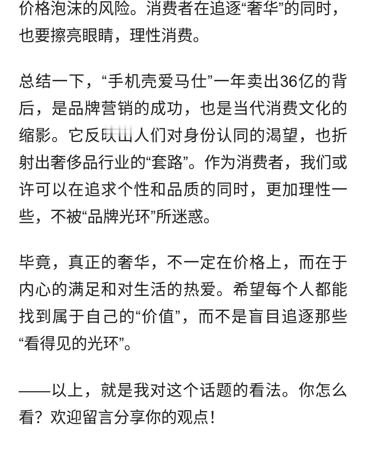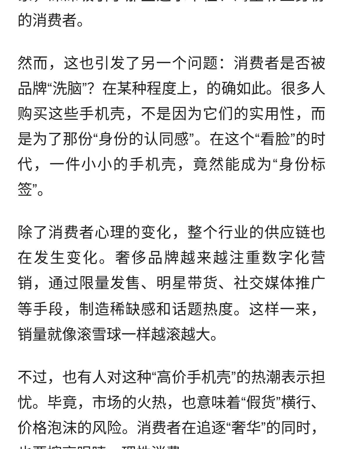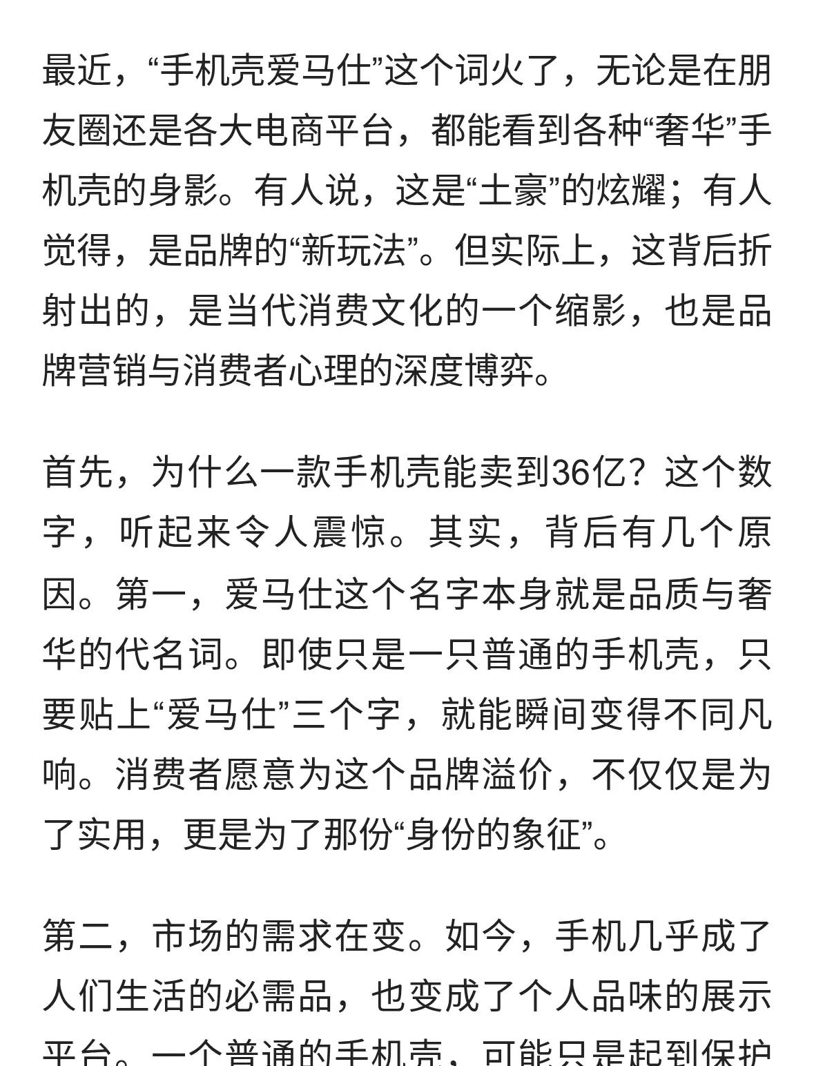 这则消息引发关注,关于“手机壳爱马仕”一年销售36亿的背后,反映出当下奢侈品与日常消费品结合的商业趋势,以及品牌价值与市场策略的深层次密码。以下是详细分析: 1. 品牌溢价与奢侈品效应 爱马仕作为顶级奢侈品牌,代表着高端、品质与身份象征。即使是手机壳这样的小配件,也能以“爱马仕”品牌冠名,极大提升产品的价值感。 品牌溢价:消费者愿意为品牌溢价买单,追求“名牌效应”和身份象征。 2. 产品多元化与品牌延伸 传统上,奢侈品牌主要经营服装、包袋、配饰等。将品牌延伸到手机壳等日常用品,是品牌多元化的表现。 这不仅扩大了品牌影响力,也开辟了新的利润增长点。 3. 市场需求与消费升级 现代消费者对个性化、时尚化的手机配件需求旺盛。高端手机壳满足了“既要保护手机,又要彰显品味”的双重需求。 经济水平提升带来消费升级,愿意为品质和品牌付出溢价。 4. 营销策略与限量/联名款 可能通过限量版、联名款等方式制造稀缺感,激发消费者的购买欲望。 高端品牌的营销策略强调“身份认同”和“生活品味”。 5. 背后隐藏的商业密码 品牌价值的资本化:将品牌影响力转化为具体的销售额。 产品差异化:通过设计、材质和品牌故事,打造差异化竞争优势。 粉丝经济:利用品牌粉丝基础,形成忠诚度和重复购买。 价格策略:高价策略带来高利润,且利润空间大。 6. 潜在风险与挑战 过度品牌化可能引发“同质化”或“品牌疲劳”。 市场竞争激烈,需不断创新和维护品牌价值。 总结 “手机壳爱马仕”一年狂卖36亿,背后折射出品牌价值的资本化、消费升级、产品多元化以及营销策略的成功。这不仅是奢侈品牌延伸的典范,也反映出当代消费市场对个性化和品质的追求。