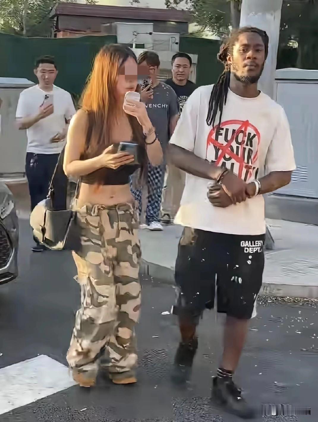 这个姑娘到底是怎么想的,看看这位黑人身上衣服所标注的英文是什么意思?这不是自取其辱吗? 看看后边几个男同胞的反应,就这么不在乎别人的眼光,自己穿的花枝招展的,长的也挺漂亮挺耐看的,找一个什么样的男朋友找不到,就这种条件如果要是找一个又帅又有钱的也不难啊!