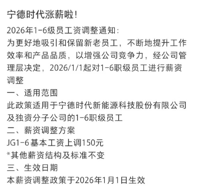 宁德时代发布涨薪通知 虽然钱不多,但是很多宁德员工心里舒服多了,因为卡着3级升不上去,现在拿着4级的工资。