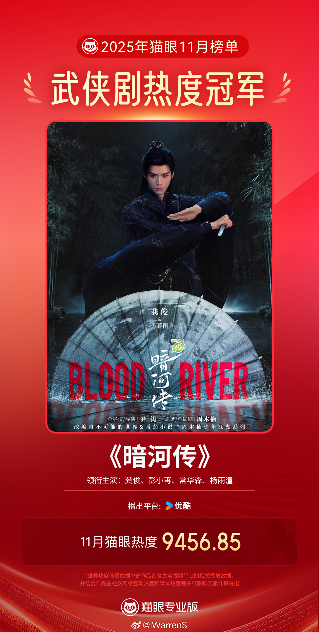 恭喜龚俊领衔主演暗河传11月武侠剧热度冠军啦!