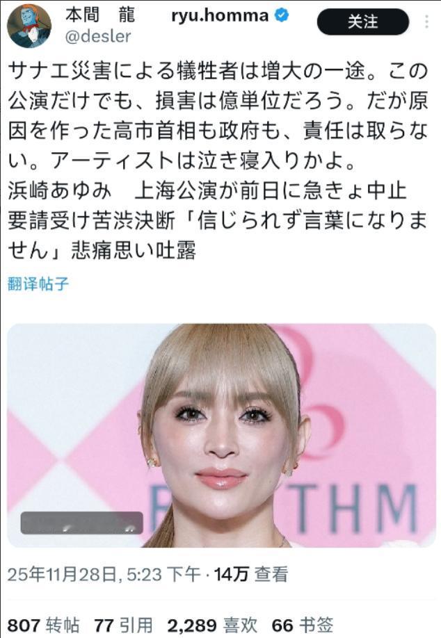 11月29号,日本媒体基本没有在讨论高市早苗和台海问题的了,而都把主要的舆论力量都放在了两件事情上——一个是著名歌手滨崎步在上海的演唱会被取消;另一个是一位日本歌手在中国演出时,中途被拉闸停演。 先说滨崎步那演唱会,本来定在 11 月 29 号晚上在上海开,还是她亚洲巡演的收官站,之前北京、杭州的都顺顺利利办完了,舞台都搭好了,中日两百来号工作人员忙了五天,结果开演前一天下午,主办方突然发公告说取消了,理由是 “不可抗力”,还说门票 30 天内全额退,不用观众操任何心。 滨崎步自己也在社交平台上说,当天早上突然接到取消通知,连当面给粉丝道歉的机会都没有,最后没办法,就在空无一人的场馆里把整场表演录了下来,算是给团队和粉丝一个交代。 再说说那个中途被拉闸的日本歌手,是叫大槻真希,在上海的万代南梦宫嘉年华上表演,正唱着《航海王》的歌呢,舞台灯光和音响突然就全断了,她一脸懵,后来被工作人员赶紧护着走了。 不光她这场黄了,第二天原定的表演也没办成,最后整个嘉年华剩下的活动全取消了,连本来要去的另一个日本偶像团体 “桃色幸运草 Z” 也没法演了。 她经纪人后来只说 “不可避免的情况”,但明眼人都能看出来这不是意外。 其实这俩事根本不是孤立的,最近一堆日本艺人的在华活动全黄了,爵士钢琴家上原广美的表演停了,《美少女战士》的音乐剧在杭州、北京的演出也取消了,甚至《蜡笔小新》的新电影都没法按时上,连超人力霸王的主题展、动漫音乐会这些都被叫停了,前前后后得有二十多场。 为啥这么集中?说白了,根子就在日本那边,之前日本首相高市早苗发表涉台错误言论,直接踩了咱们的红线,中日关系一下就紧张起来了。 最让人不忿的是日本媒体这操作,他们倒好,压根不提高市早苗乱说话的事,也不聊台海问题的本质,一门心思盯着这些演出取消的事儿炒,故意避重就轻转移焦点。 好像是咱们平白无故刁难他们艺人似的,可他们咋不说说,是他们先在原则问题上犯了错? 台海是咱们自家的事,轮得到外人指手画脚?他们官方先越过红线,破坏了两边交流的基础,文化活动受影响不是必然的吗? 咱从来不是不讲理的人,之前日本艺人来演出、动漫展举办,咱都欢迎,粉丝们也能开开心心看表演。 但前提是互相尊重,尤其是在核心利益问题上不能含糊。 这次这么多活动黄了,主办方全说 “不可抗力”,这四个字其实已经把原因点透了 —— 不是咱不想办,是大环境不允许了,谁让他们官方先挑事呢? 滨崎步那事儿其实挺让人唏嘘的,她自己也挺无辜,还特意让粉丝别穿红衣服,取消舞台上的红色元素,想顺顺利利办完演出,结果还是没办成。 但没办法,原则问题上没有含糊的余地,日方要是不纠正自己的错误言论,这种影响肯定还得持续。 那些说咱们搞 “限制” 的,咋不想想当初 “萨德事件” 后韩国艺人的情况?都是对方先破坏规矩,才引来的连锁反应。 日本媒体现在一门心思盯着演出说事儿,就是想制造一种 “中国在打压日本文化” 的假象,好让国际上不明真相的人误会咱们。 可事实摆在这儿,是他们先在台海问题上挑衅,触碰了咱们的底线,才导致文化交流受影响。 要是他们能好好说话、守规矩,这些演唱会、动漫展不都能正常办吗?粉丝开心,艺人也能赚钱,两边都好。 说白了,这事儿的逻辑特简单:你尊重我的核心利益,咱就好好交流,演唱会、电影该咋办咋办;你要是蹬鼻子上脸,在原则问题上乱蹦跶,那交流自然就没法顺利进行。 日本媒体想靠避重就轻蒙混过关,门儿都没有。 咱普通人都能看明白的事儿,他们那些媒体心里门儿清,就是故意装糊涂,想转移国内民众的注意力,掩盖他们官方犯错的事实。 所以别被日本媒体带偏了,这俩演出取消的事儿是真的,但根本原因是日方先挑的事。 不是咱不待见日本艺人,是不接受他们官方在台海问题上胡来。 啥时候他们摆正态度了,不瞎掺和咱家务事了,这些文化活动自然就能恢复正常。现在这情况,都是他们自找的,怨不得别人。 参考资料: 多个日本艺人在华活动取消,旅行社称赴日团体游几乎全部取消 2025-11-29 23:16·大河报