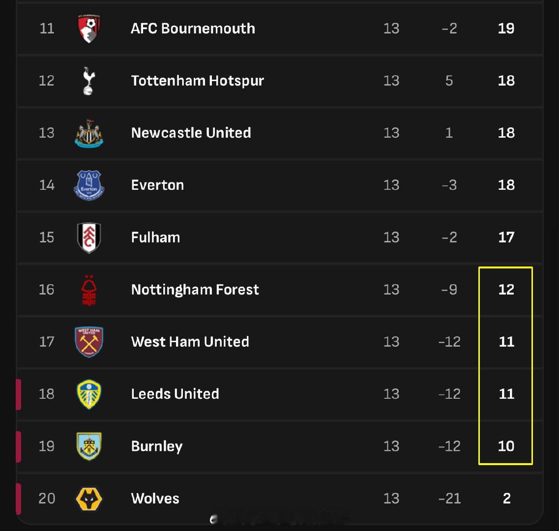 【英超保级战格局确定】英超联赛13轮过后,积分榜的下半区,除了狼队是“降级大热”之外,森林+西汉姆+利兹联+伯恩利,一共5队被卷入保级战,最后只有两队留在英超,你认为是哪两队呢?