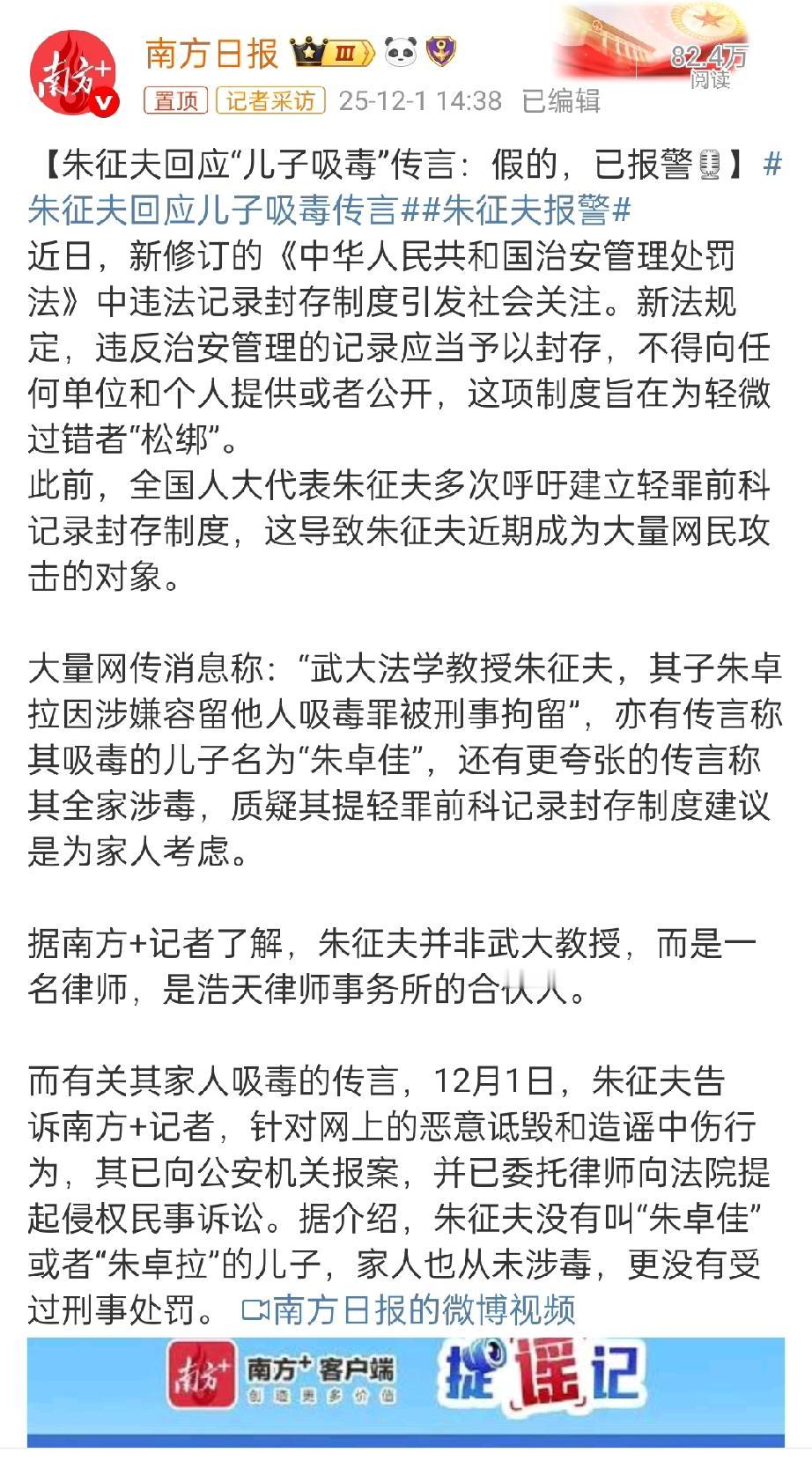 朱征夫儿子被指吸毒的传闻,果然是假的。 12月1日,朱征夫向南方日报表示,针对网上的恶意诋毁和造谣中伤行为,其已向公安机关报案,并已委托律师向法院提起侵权民事诉讼。 朱征夫表示,他没有叫“朱卓佳”或者“朱卓拉”的儿子,家人也从未涉毒,更没有受过刑事处罚。 [吃瓜群众][吃瓜群众][吃瓜群众]朱标儿子 朱辰征 分享心情感悟