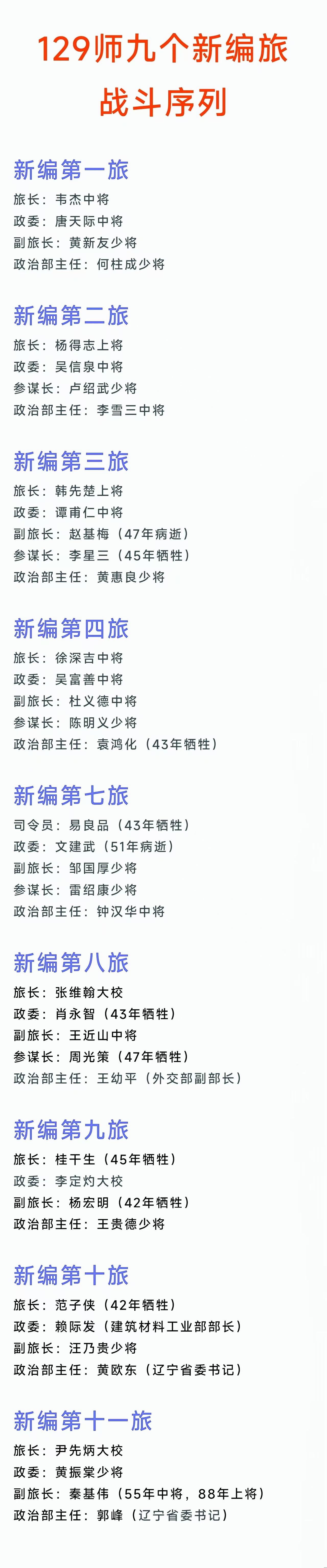 八路军129师9个新编旅中,为啥这两个旅的旅长仅是开国大校,副旅长却是开国中将? 我们知道129师最初成立时仅有2个数字旅,但后来我129师迅速发展壮大,先后组建了冀鲁豫支队、先遣纵队、冀西游击总队、青年抗日纵队、东进纵队、筑先纵队等部队。 为了更方便的指挥及正规化发展,129师对下辖的部分部队进行了整编,编为9个新编旅,比如筑先纵队、先遣纵队合编为新编第八旅,冀西游击纵队、边纵第2团、赞皇独立团合编为新编第十一旅。 新编第八旅旅长张维翰、副旅长王近山;新编第十一旅旅长尹先炳、副旅长秦基伟;55年授衔张维翰、尹先炳授大校,王近山、秦基伟授中将,两位副职比正职的军衔都要高两级。 四人中张维翰资历最浅,参加革命时间最晚,其他3位都是老红军。张维翰是在全面抗战爆发前夕加入我党的,后在抗日爱国将领范筑先部的抗日游击司令部第10支队任司令员,1939年该部正式编入八路军,番号为筑先抗日游击纵队,由张维翰任司令员。 后该纵队与先遣纵队合编为新编第八旅,由张维翰任旅长,张维翰担任军事主官、指挥部队时间的并不长,经验不是很丰富,上级便把在385旅任副政委的王近山调过来任副旅长,王近山有“王疯子”之称,打仗是把好手,是我军名将。 虽说张维翰当时的职务比王近山要高,但实际上无论是资历还是作战经验都比不上王近山,张维翰后来也没有太多出色的表现,再加上基本上是到了抗战时期才参加革命,缺少红军时期经历,也就授了大校。 新编第十一旅旅长尹先炳是全军第一位合成军军长,是具备授中将的条件的,仅授大校纯粹是因为个人原因。