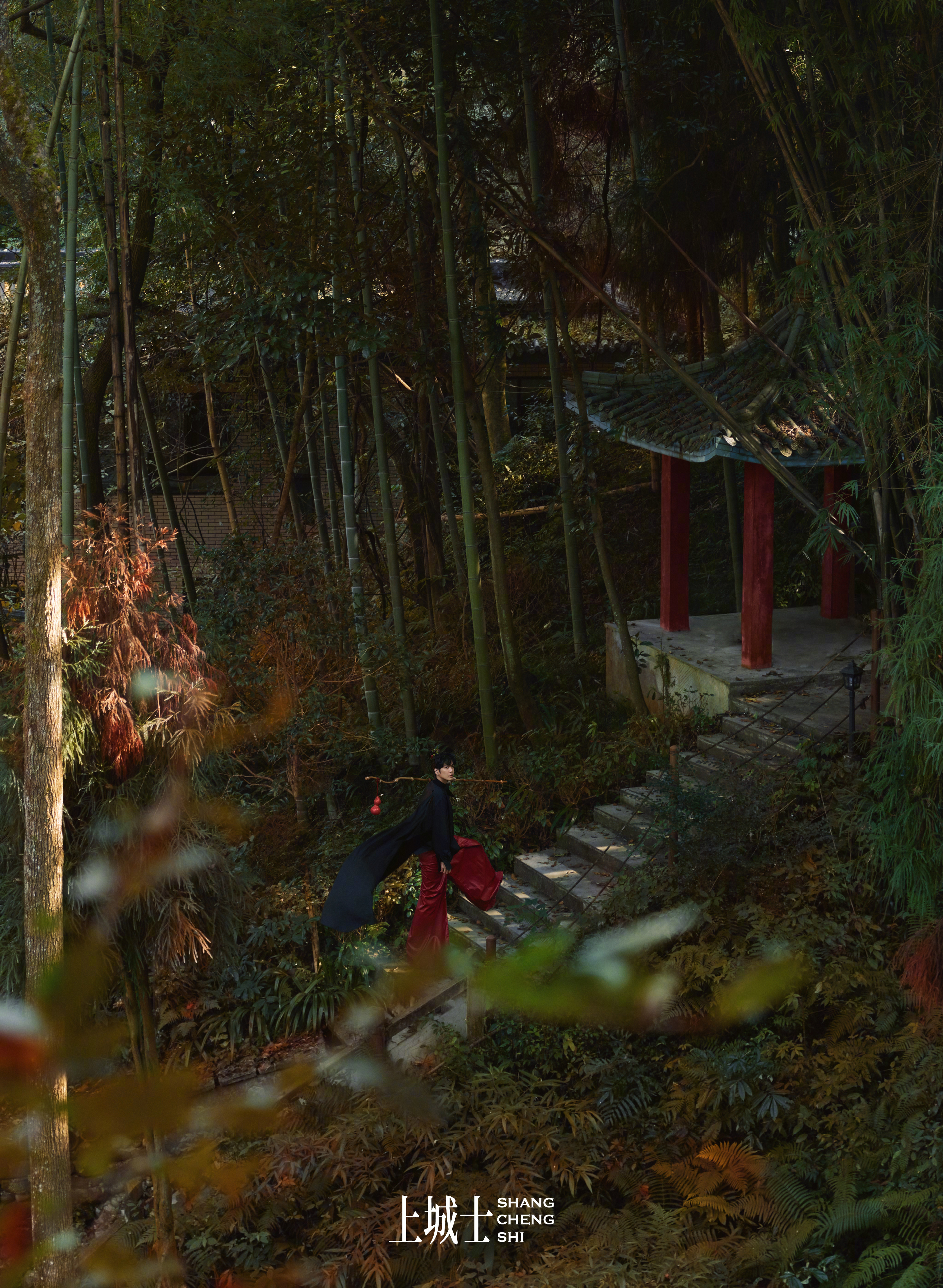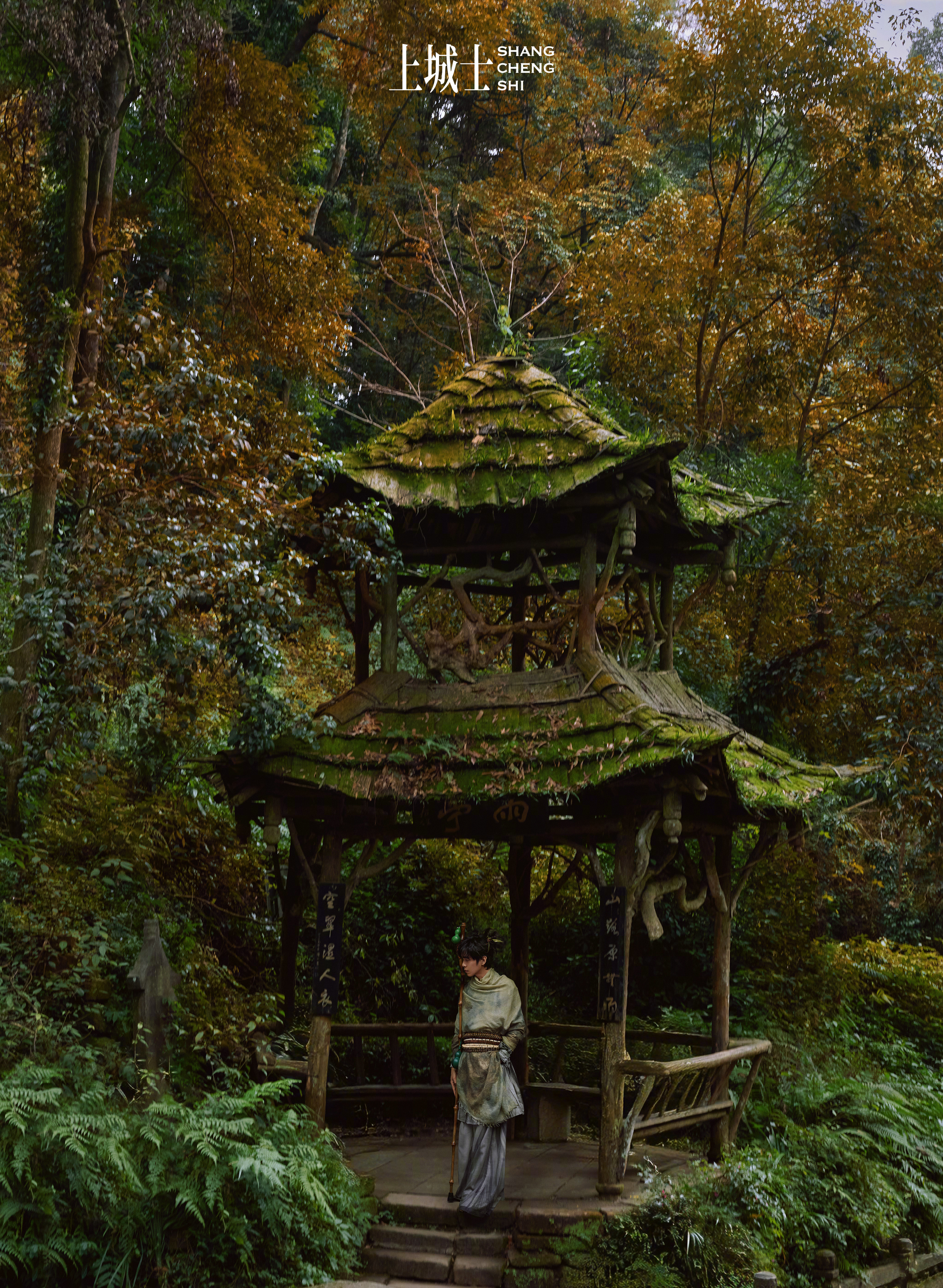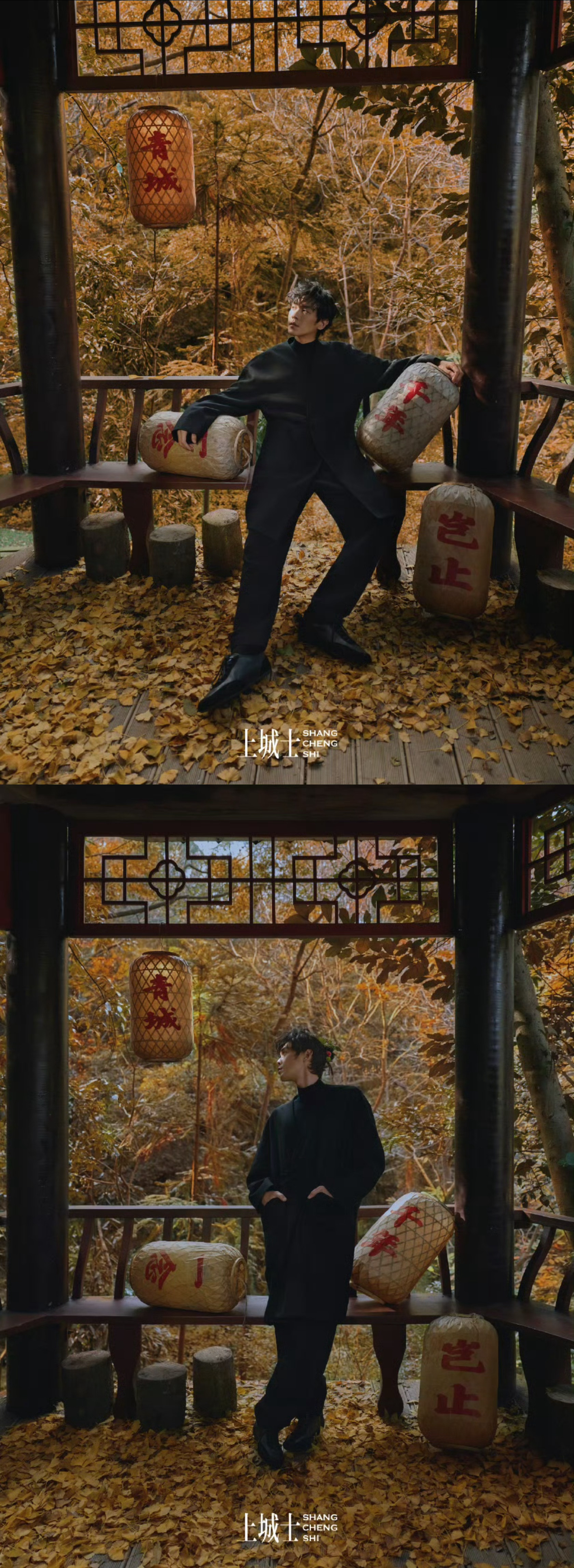 张若昀「上城士途中风物046」🪭🍵🍁 素雅长袍、竹编书箱… 穿行于古道亭阁与密林间,结合武侠意境与东方意蕴,一段秋冬时节的青城山之旅。摄影: 陈漫