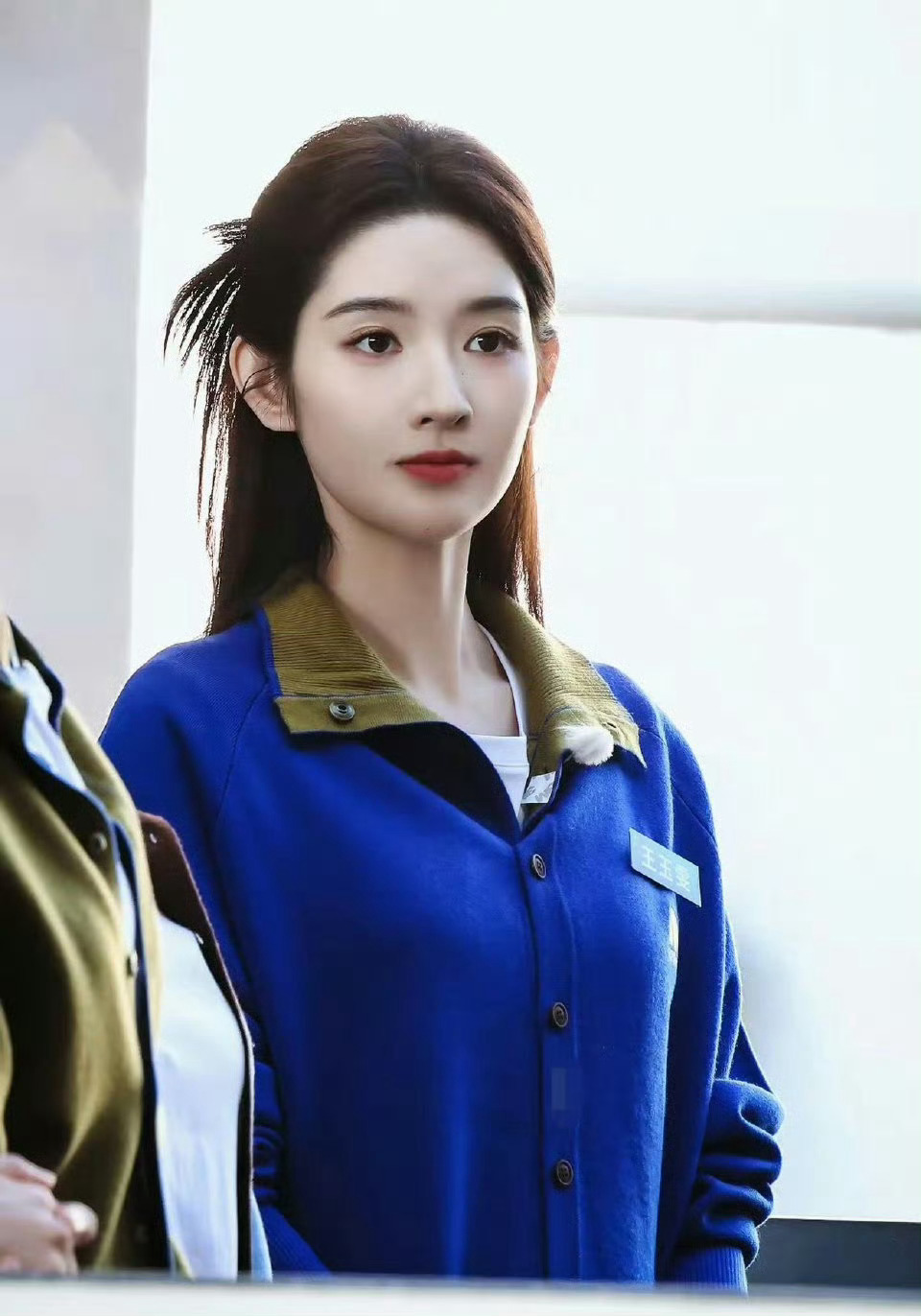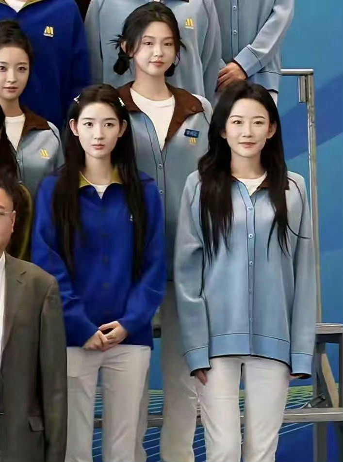 杨幂深蓝色运动风套装,长发微扬
