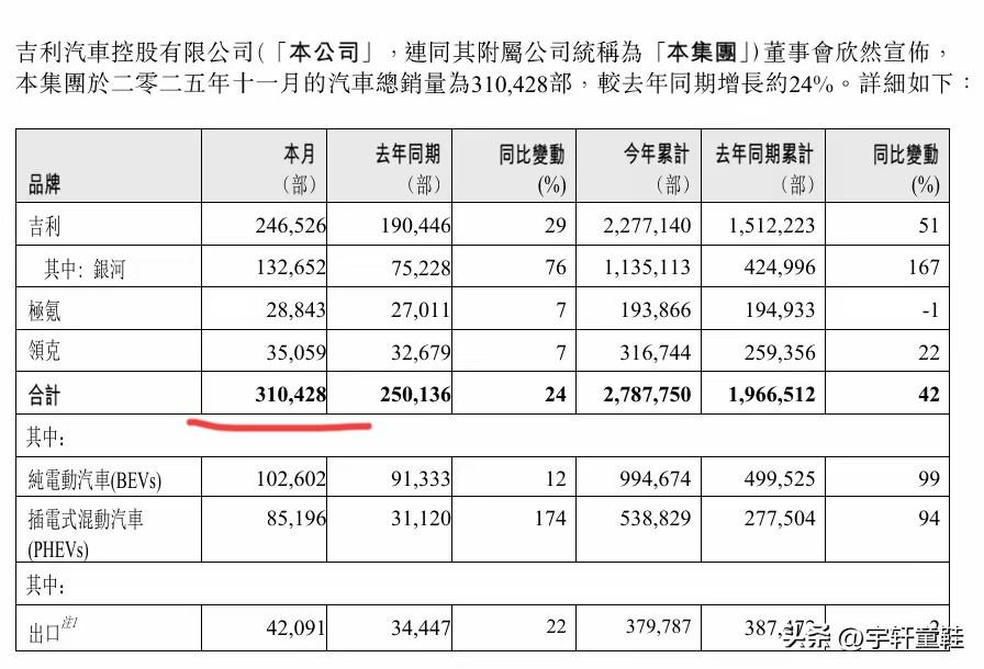 果然销量起来之后发销量数据都比较快人一步! 吉利11月销量数据正式出炉,全系总销量31.04万辆,较上月又微涨几千辆,其中吉利品牌24.6万辆,极氪品牌2.88万辆,领克品牌3.5万辆,出口4.2万辆! 接下来就等比亚迪出招了,大家觉得会有多少?[呲牙]