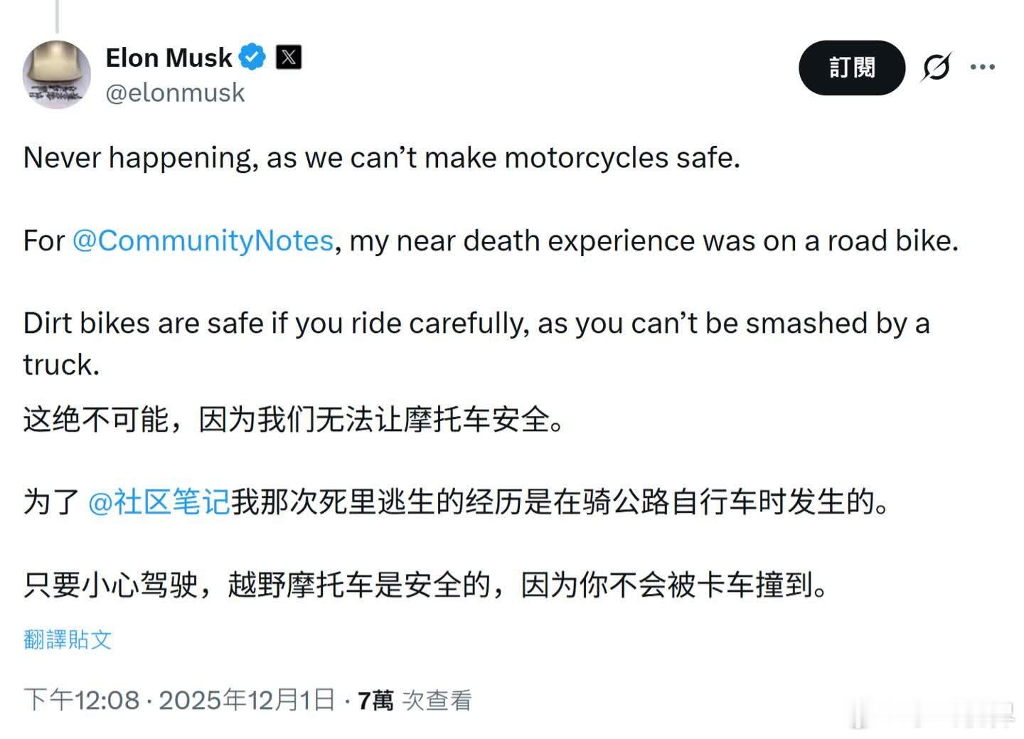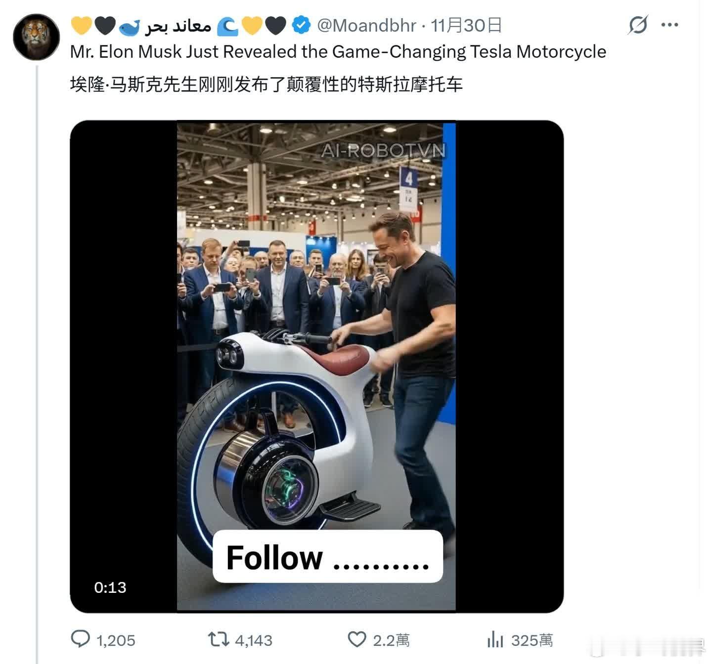 你们最近刷到那个“马斯克骑单轮摩托车”的视频了吗?说实话,第一眼看到我也惊了——特斯拉终于要对摩托车下手了?结果仔细一瞅,好家伙,又是AI搞的鬼!而且马斯克本人亲自下场打假,直接说了句:“特斯拉永远不会做摩托车!”原因特别简单,就俩字:安全