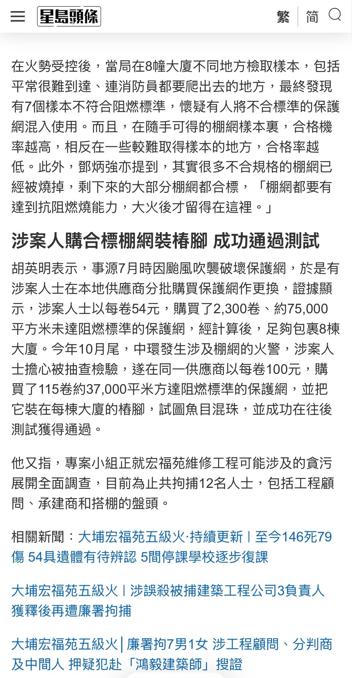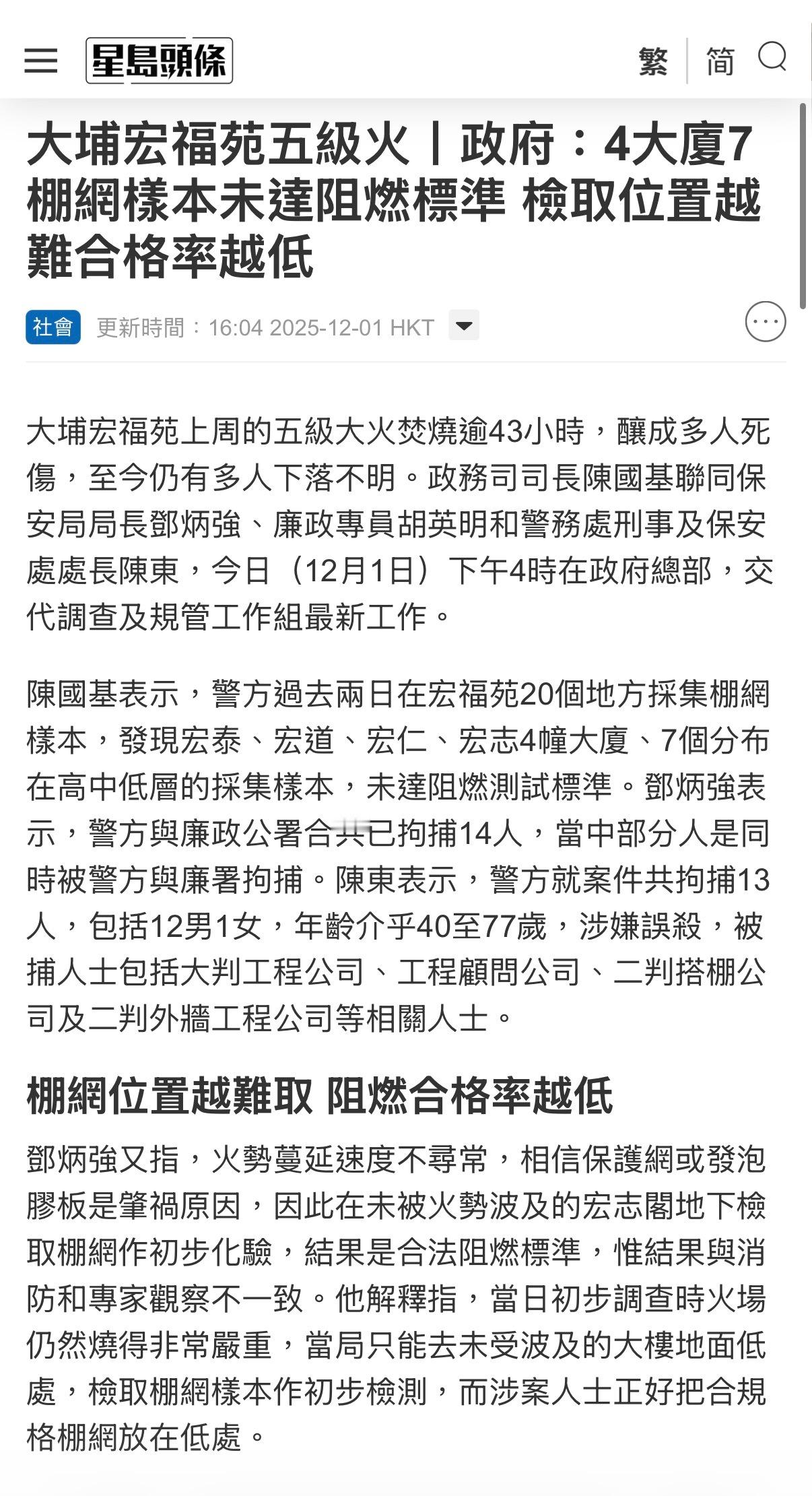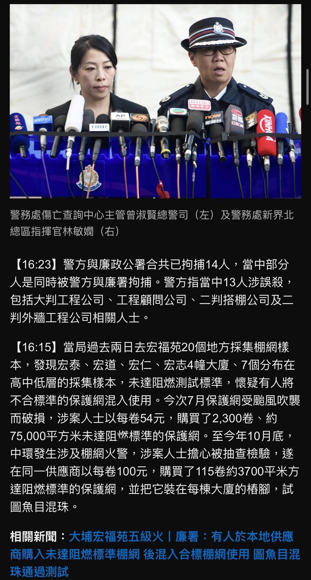 🔻香港特区政务司司长陈国基会同保安局局长邓炳强、廉政专员胡英明及警务处刑事及保安处处长陈东,今日(12月1日)下午4时在政府总部通报调查及规管工作组最新进展。🔻陈国基表示,警方过去两日在宏福苑20处地点采集棚网样本,发现宏泰、宏道、宏仁、宏志四栋大厦中共有7个分布于高中低层的采集样本未达阻燃测试标准。邓炳强指出,警方与廉政公署已联合拘捕14人,其中部分人员同时遭两部门拘捕。陈东透露,警方针对本案共拘捕13人(12男1女,年龄40至77岁),涉嫌误杀罪,被捕者包括总承建商、工程顾问公司、分包搭棚公司及外墙工程分包商等相关人士。🔻邓炳强特别说明,此次火势蔓延速度异常,初步判断防护网或发泡胶板是起火诱因。当局在未受火势影响的宏志阁地面采集棚网进行初步化验时,结果显示符合阻燃标准,但该结果与消防及专家现场观察存在矛盾。他解释称,由于火灾初期调查时火场仍存极大危险,工作人员仅能在大楼底部未过火区域取样检测,而涉案人员恰将合规棚网安置在低层区域。🔻火势受控后,当局在8栋大厦不同位置采集样本,包括平时难以抵达、连消防员都需要攀爬的区域,最终发现7个样本不符合阻燃标准,疑似有人混用不合格防护网。值得注意的是,在触手可及的棚网样本中合格率较高,而采样位置越困难的区域合格率越低。保安局局长邓炳强补充指出,大量不合规棚网已被大火焚毁,现存的大部分棚网实际符合标准,"只有具备抗燃能力的防护网才能在大火后留存"。🔻廉政专员胡英明披露,事件起因是7月台风损毁防护网后,涉案人员分批从本地供应商采购替换材料。证据表明,涉事者以每卷54元价格购入2300卷(约75000平方米)未达阻燃标准的防护网,经核算足以覆盖8栋大厦。10月底中环发生棚网火灾后,涉案人员担心被抽检,遂以每卷100元向同一供应商采购115卷(约37000平方米)达标阻燃棚网,专门安装在各栋大厦桩脚位置企图蒙混过关,此后也确实通过了相关检测。🔻专案小组正就宏福苑维修工程可能涉及的贪污问题展开全面调查,目前已拘捕12人,包括工程顾问、承建商及棚架工程包工头。🔻via 星岛头条香港火灾已致151人遇难热点现场