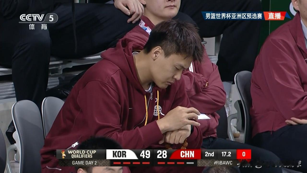 中国男篮老将赵睿真是心灰意冷了!在今天中国男篮客场挑战韩国男篮的比赛中,当时比赛进行到了第二节的最后时刻,中国队以28:49落后对手21分,此时转播镜头给到了场边观战的赵睿,只见赵睿已经完全没有心思观看场上的比赛了,整个人看起来特别的失落和沮丧。从赵睿的面部表情来看,他对于队友的表现真是心灰意冷了。